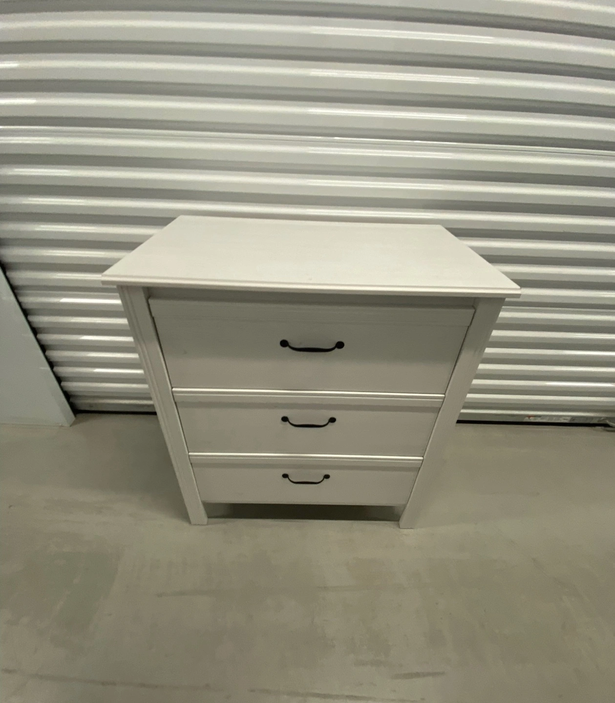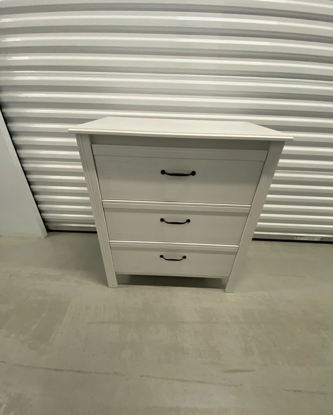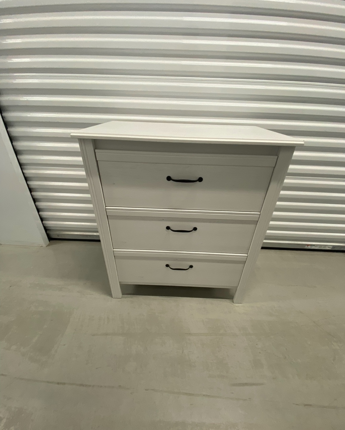 Three-drawer dresser. White finish. Black handles. Good condition.