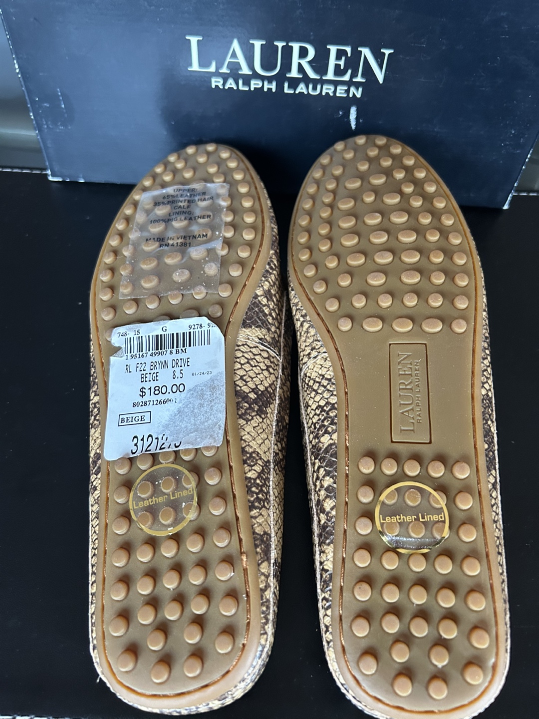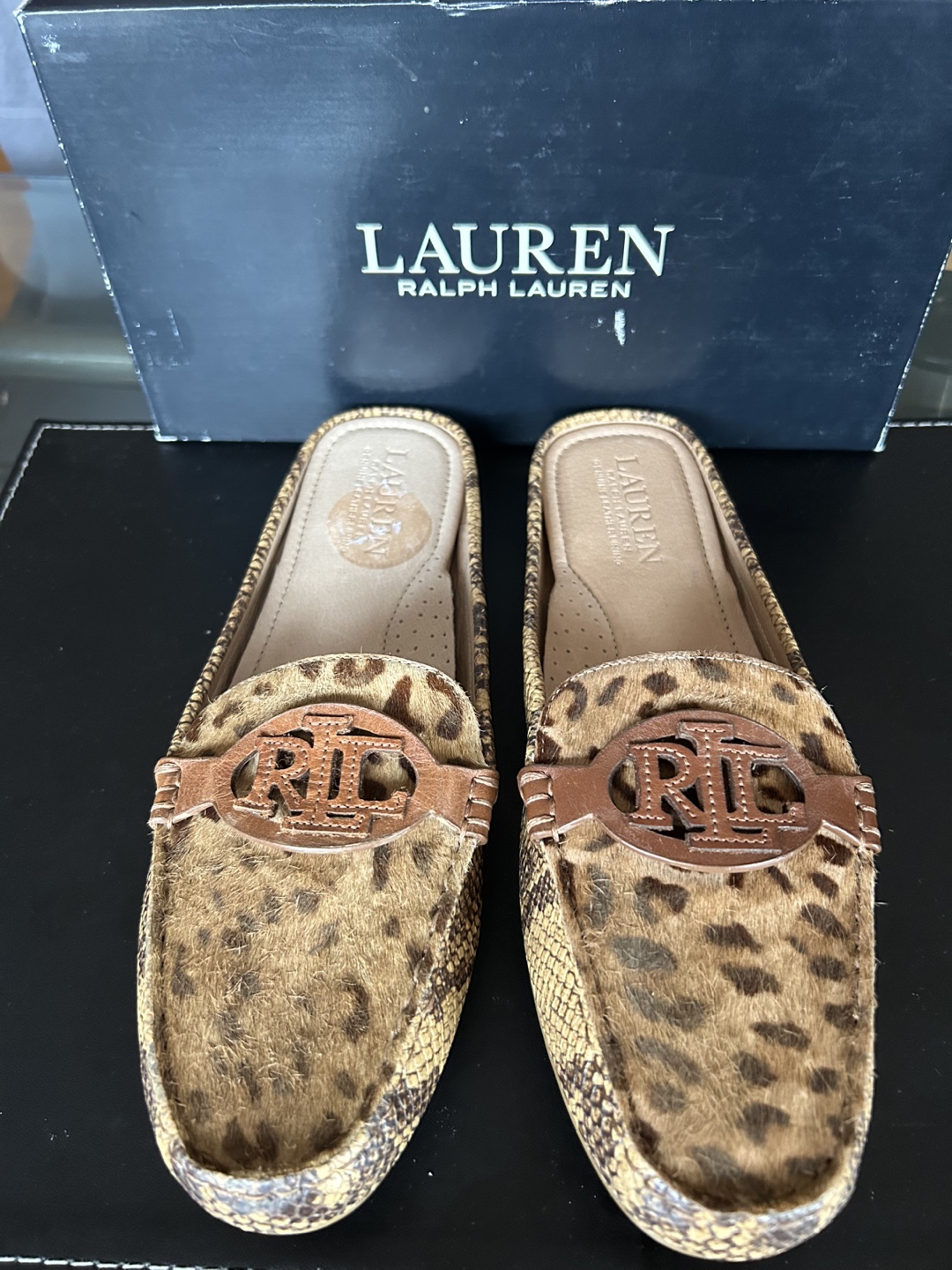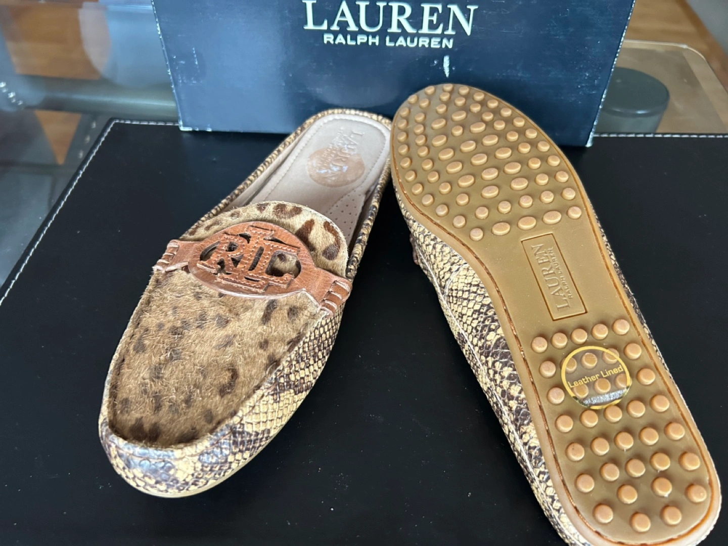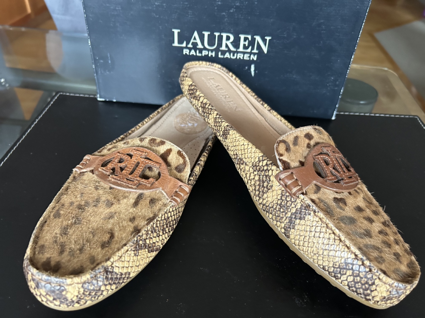 * Leopard print calf hair and snakeskin print leather. Brown leather accents. RL logo detail. Comes in original box.