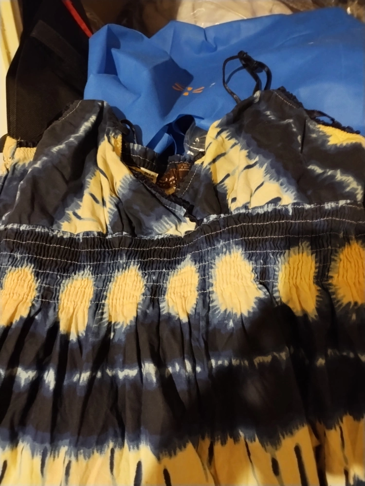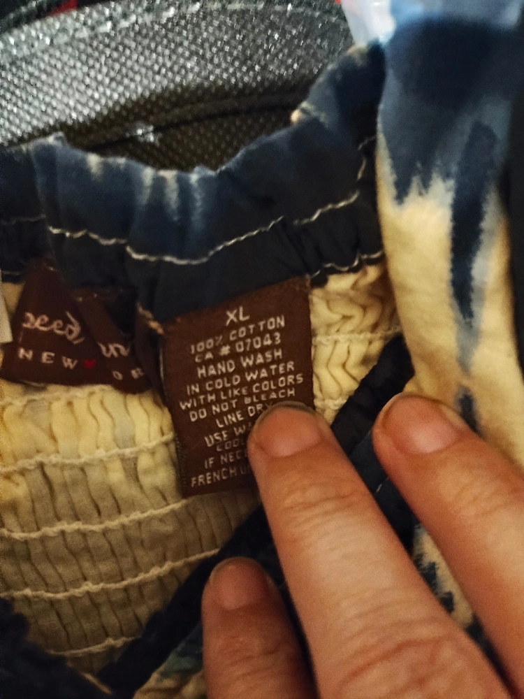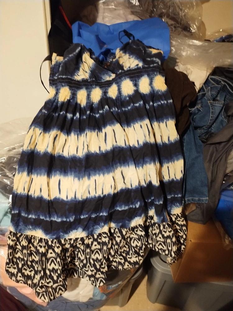Flowy summer dress. Features a smocked bodice and tiered skirt. Blue and beige tie-dye pattern. Size XL. 100% cotton.