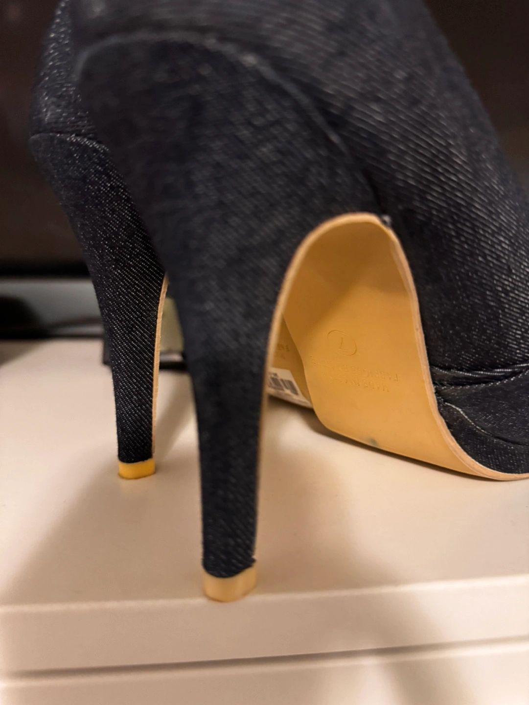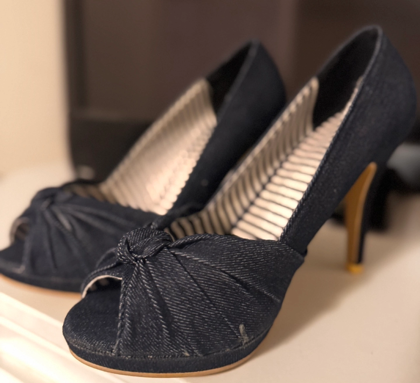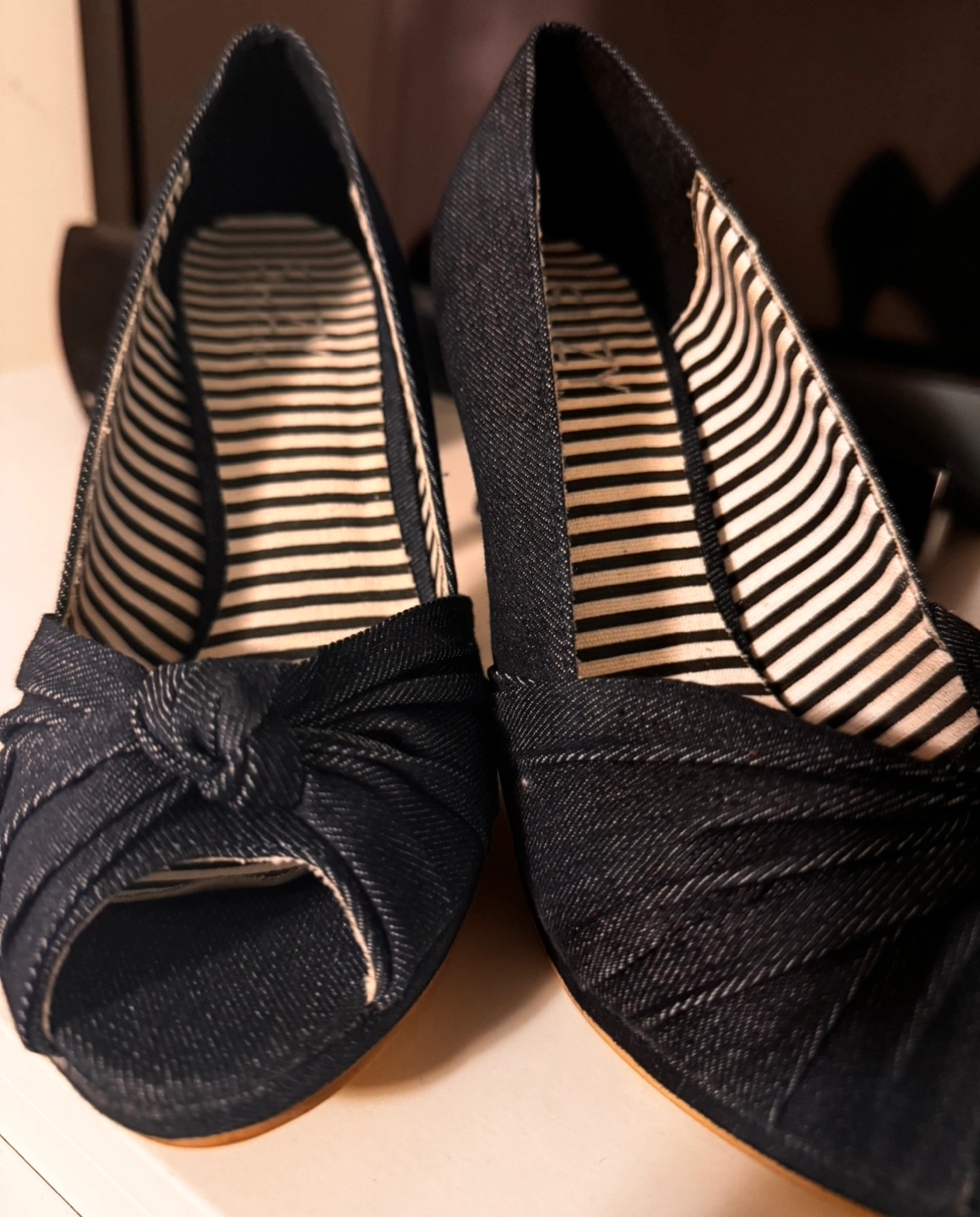Stylish dark wash denim peep-toe heels. High heels. Fabric upper. Striped fabric lining. Size 7. Pick up at Riverbend SE Cash only