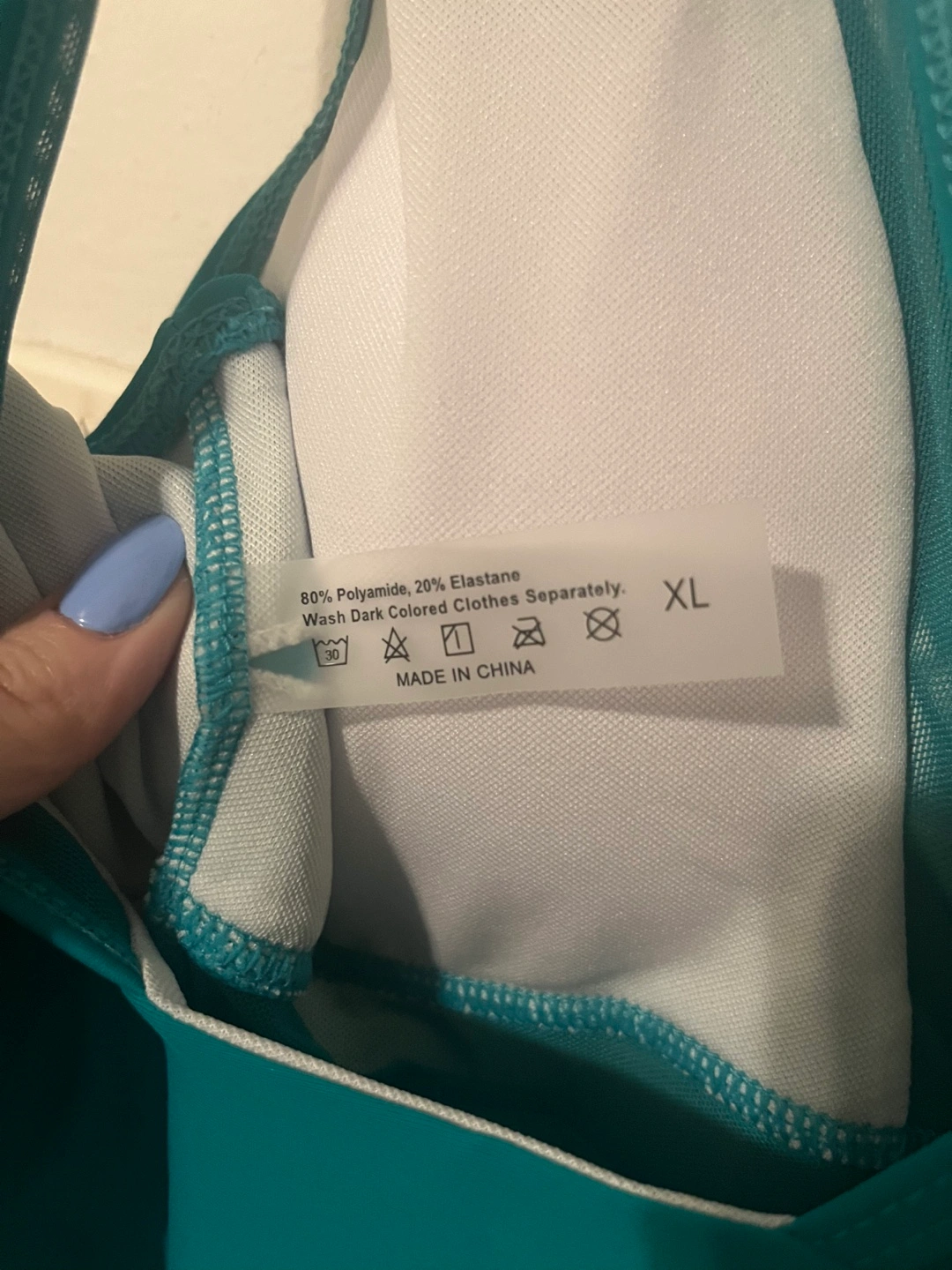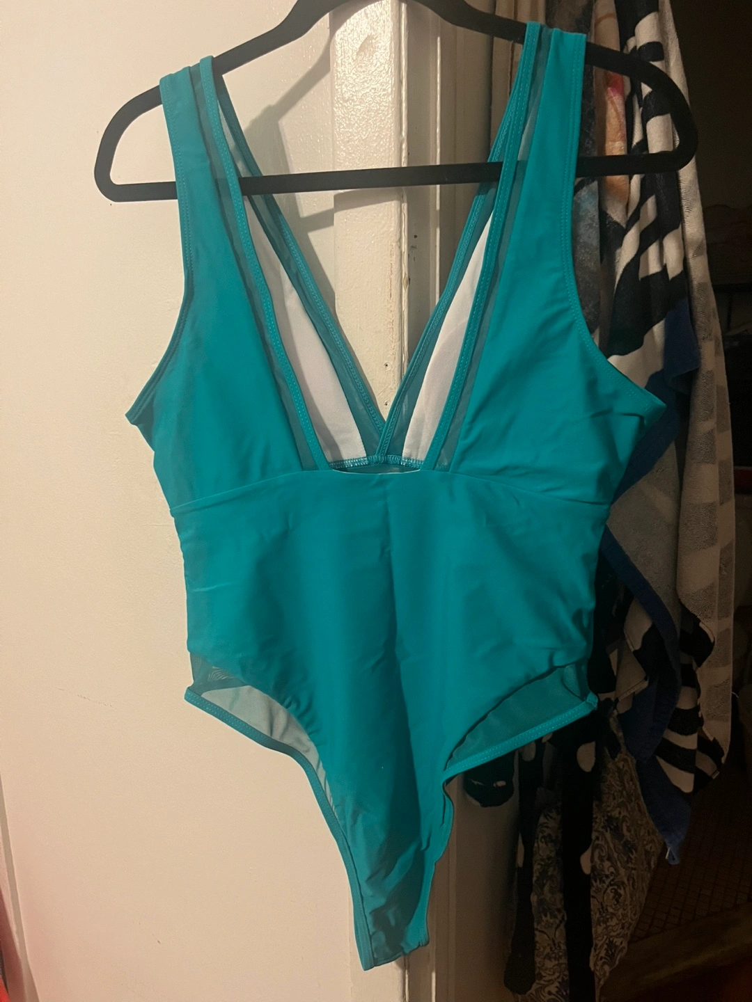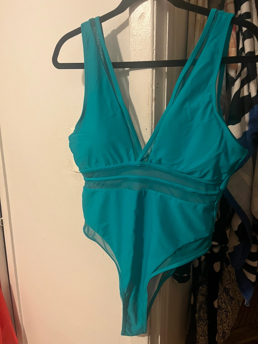 Women's teal one-piece swimsuit. Features a V-neckline and mesh detailing. Size XL. Made in China.