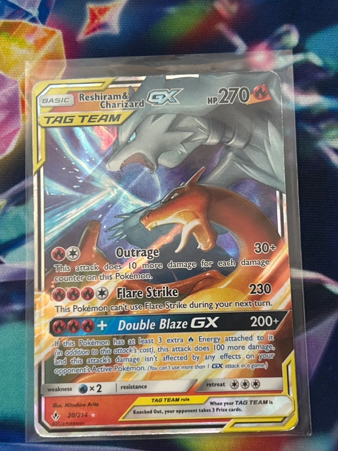 Pokemon card. Reshiram & Charizard GX. Tag Team. Number 20/214. HP/MP condition.