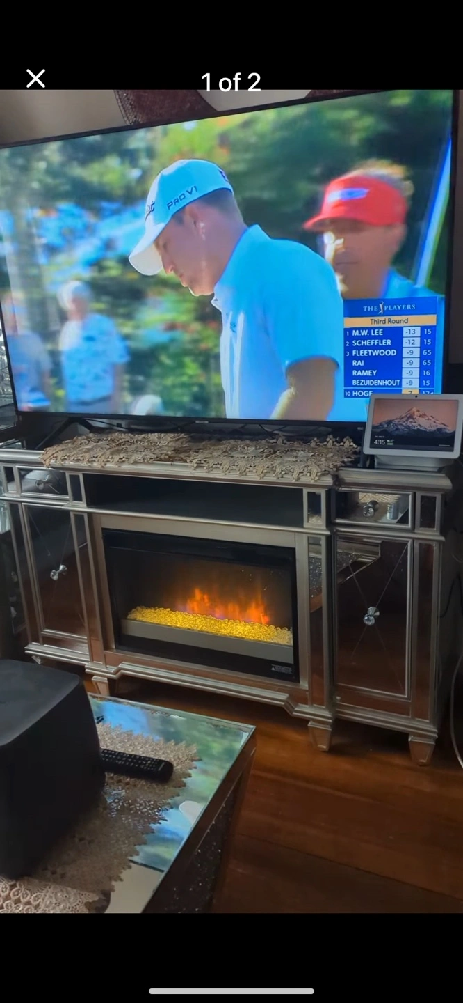 Elegant entertainment center. Features mirrored accents and built-in electric fireplace. Perfect for living room. Includes shelving and cabinet space.
