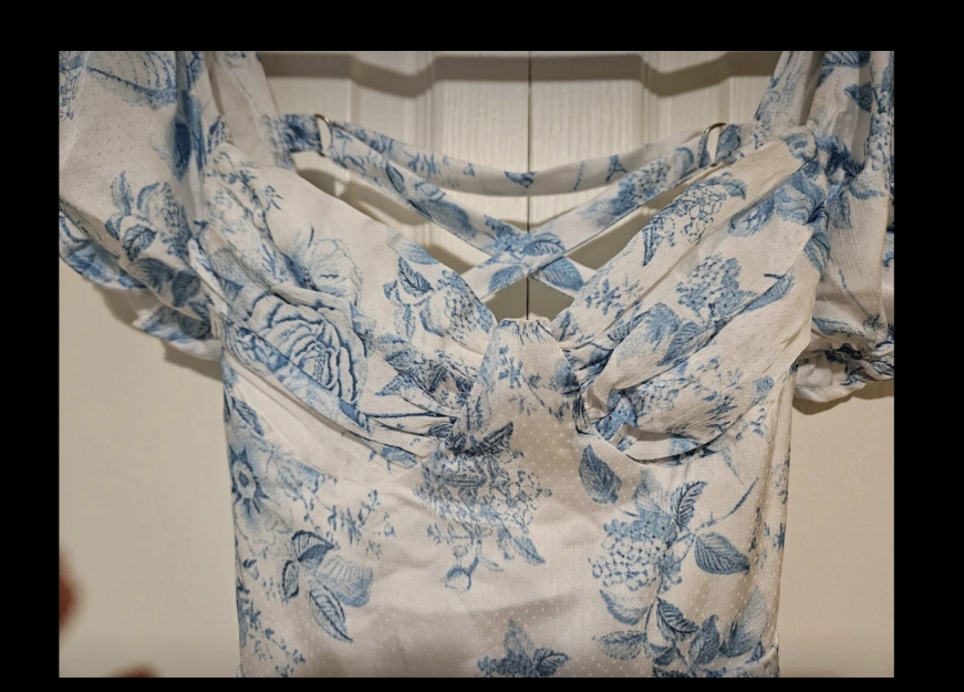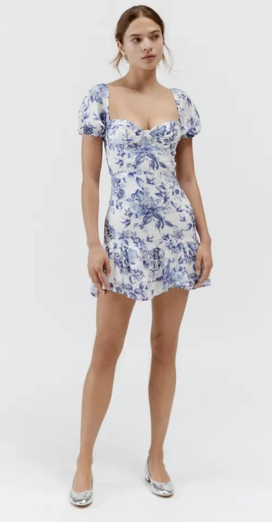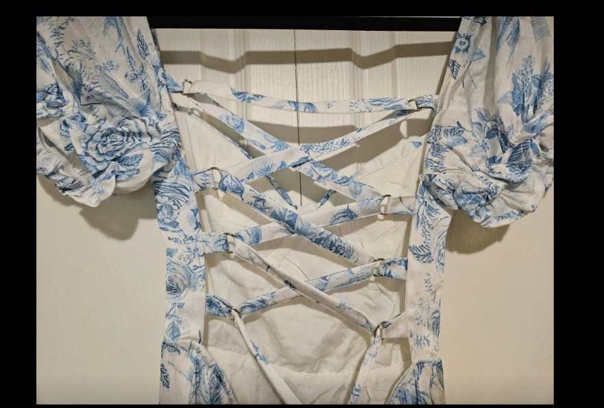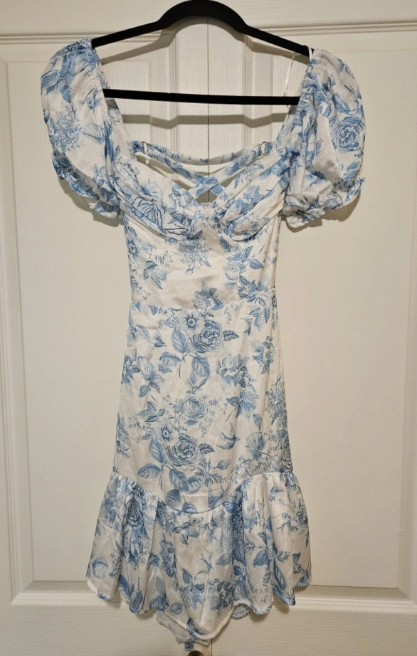 White and Blue Floral Mini Dress with Lace-Up Back💚