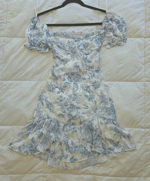 Cute mini dress. Features puff sleeves, a lace-up back, and a floral print. Perfect for summer.