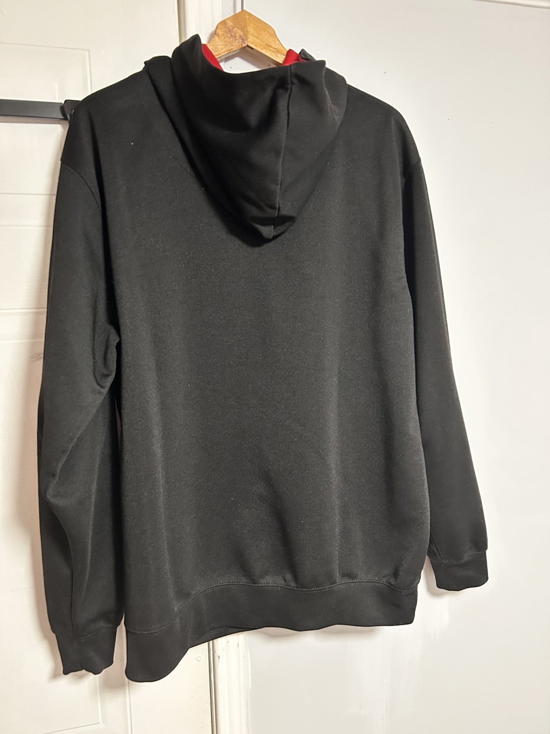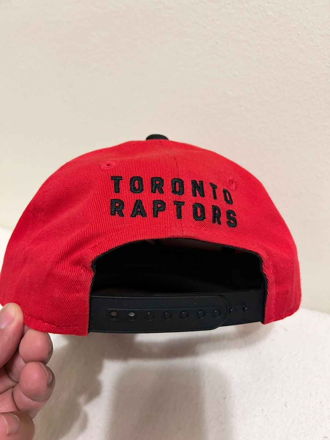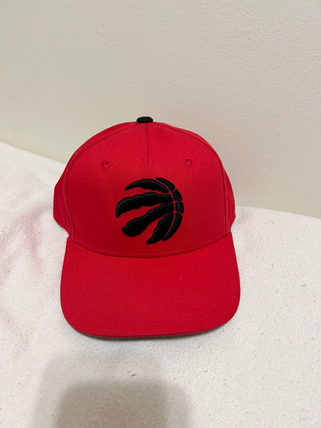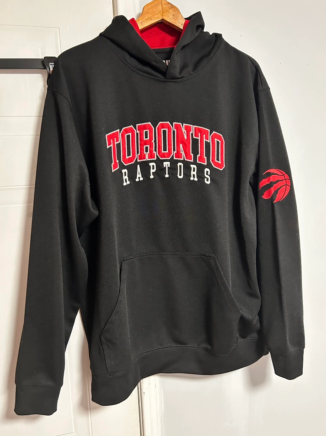 Men's Toronto Raptors bundle. Includes a red adjustable hat with team logo and lettering. Also a black hoodie with red and white lettering and logo on sleeve. Size large.