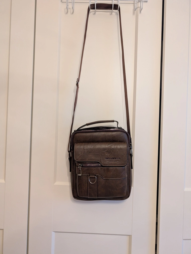 Stylish brown shoulder bag. Features a main zippered compartment, smaller zippered pocket, and an additional front pocket. Adjustable strap. Perfect for everyday use.
