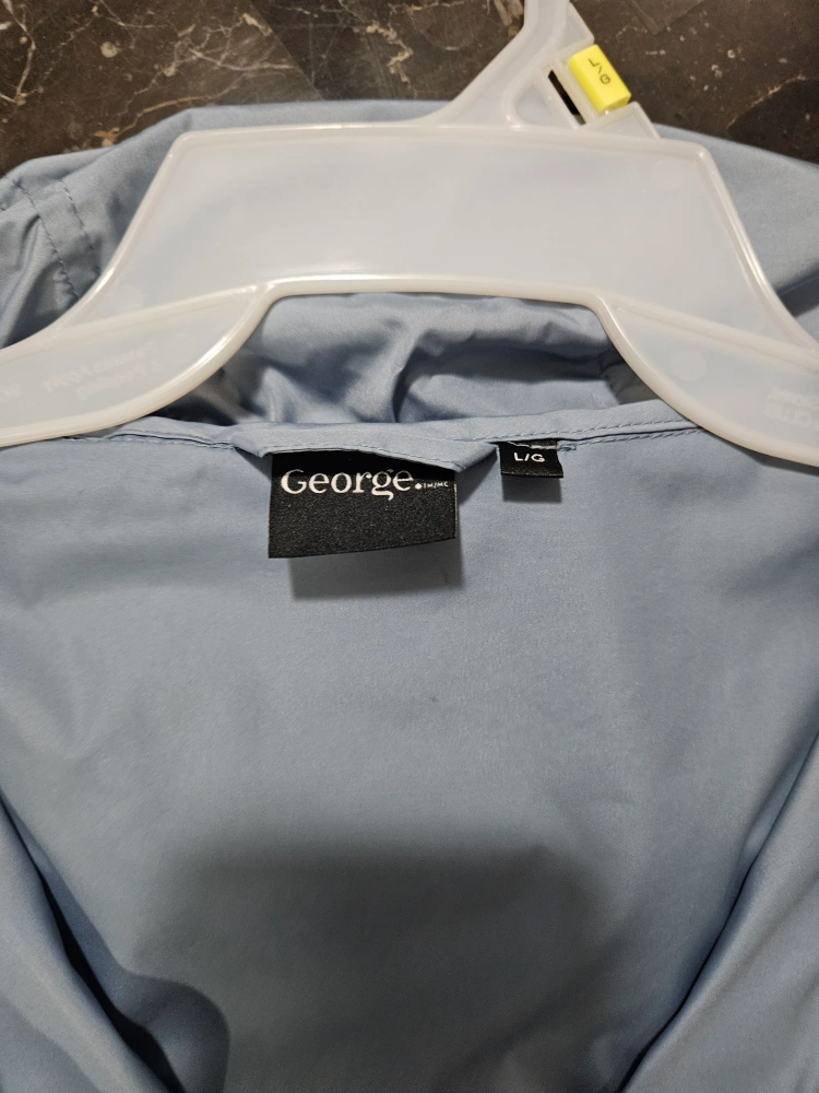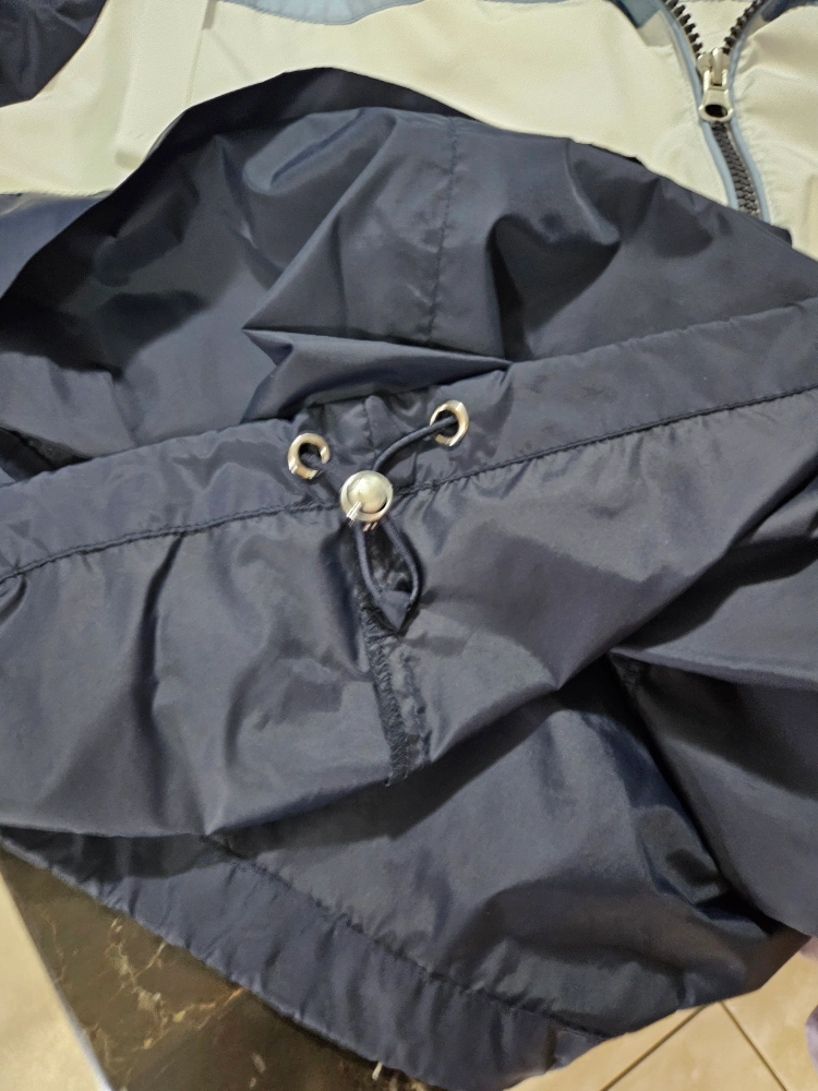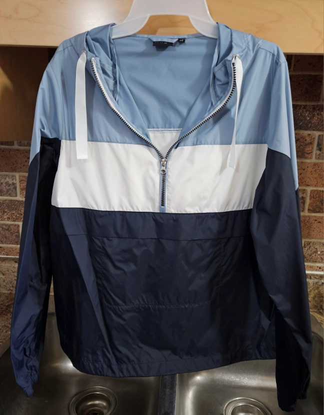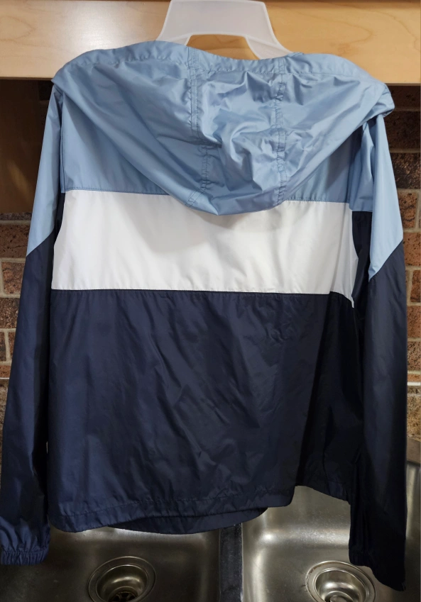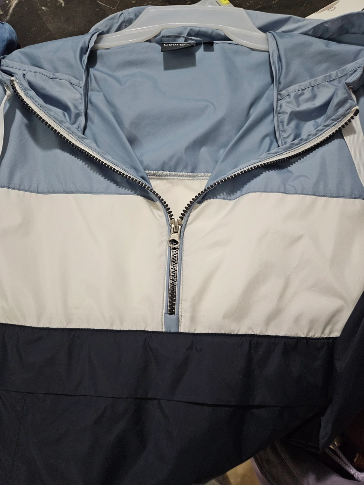 Women's size large windbreaker. Features a half zip closure, colour-blocked design, and a hood. Light blue, white, and navy blue colours. Never worn.