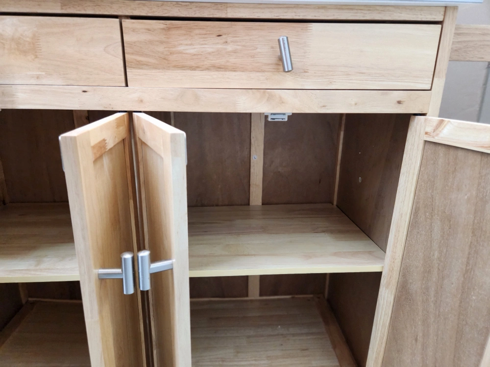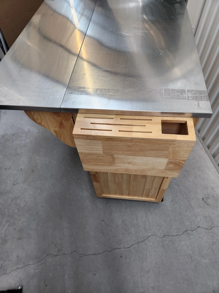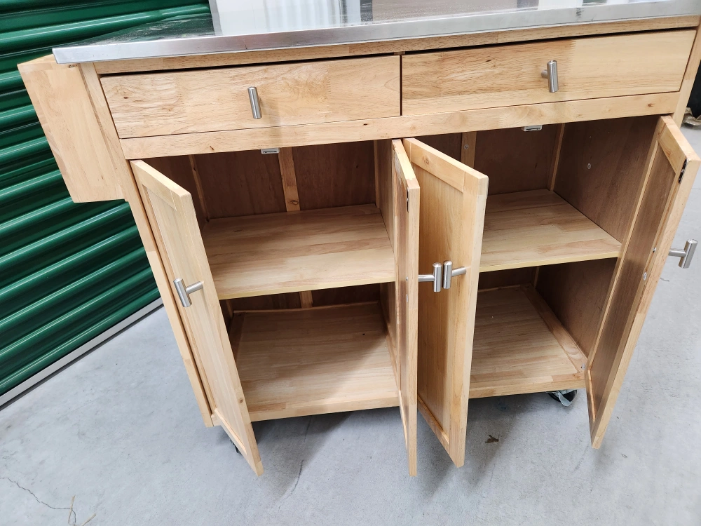 Rolling kitchen cart. Features stainless steel countertop, two drawers, and three cabinets. Plenty of storage. Wood construction. Wheels for easy mobility.