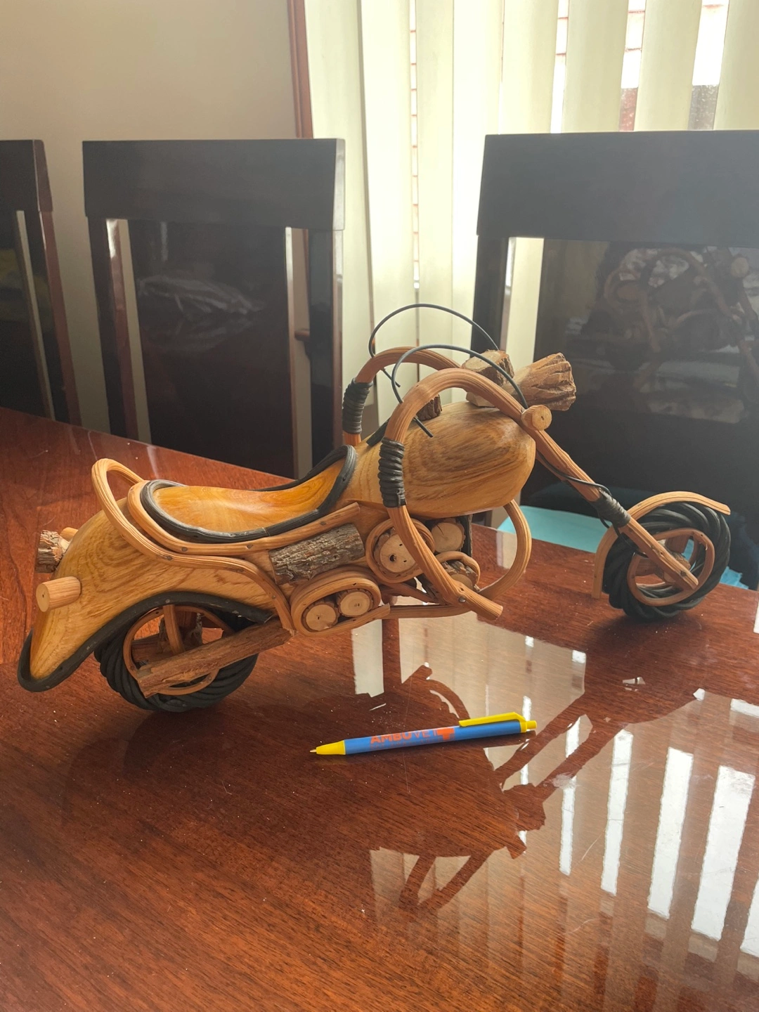 Unique wooden motorcycle model. Intricate details. Great gift or home decor. Made from wood and other natural materials.
