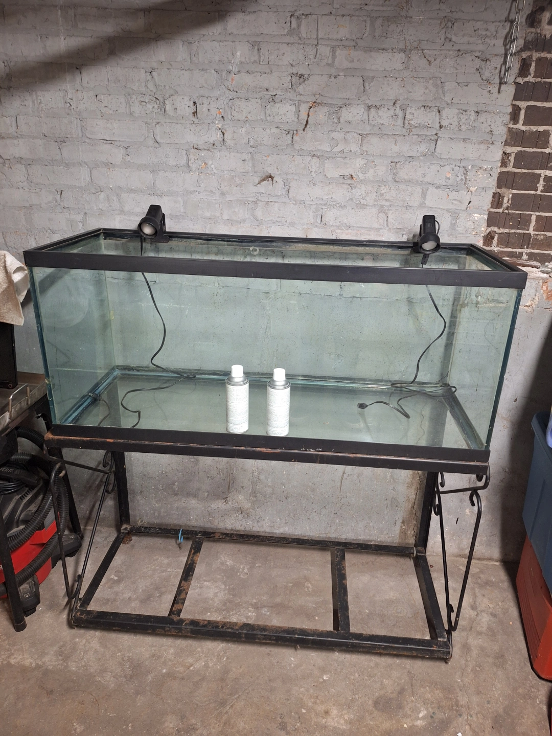 Big 100 gallon aquarium with black metal stand. Glass tank, needs cleaning. Perfect for reptiles only. comes with 2 lights, and 2 cans of black spray cans