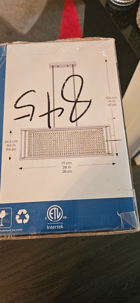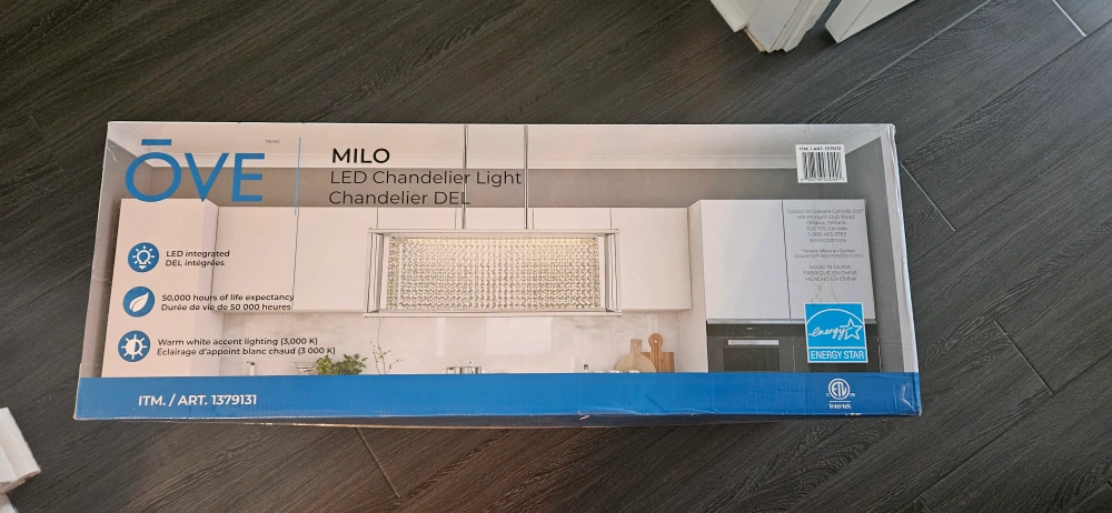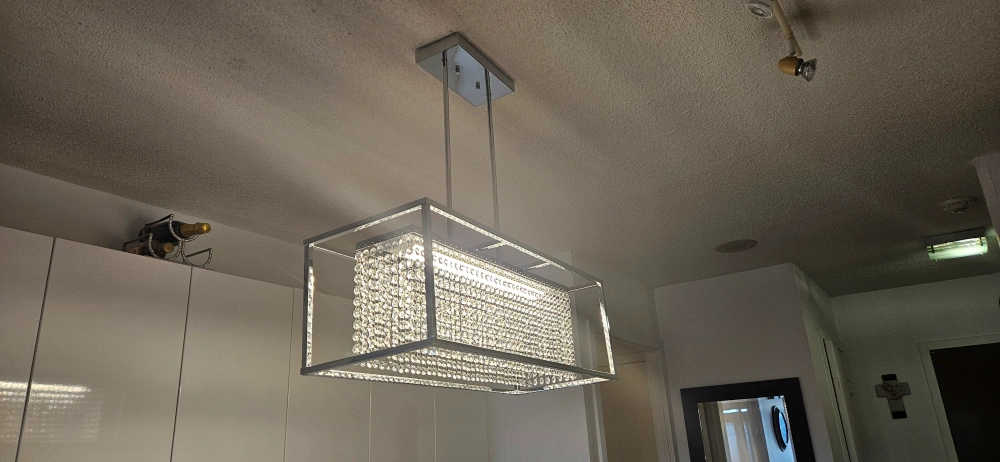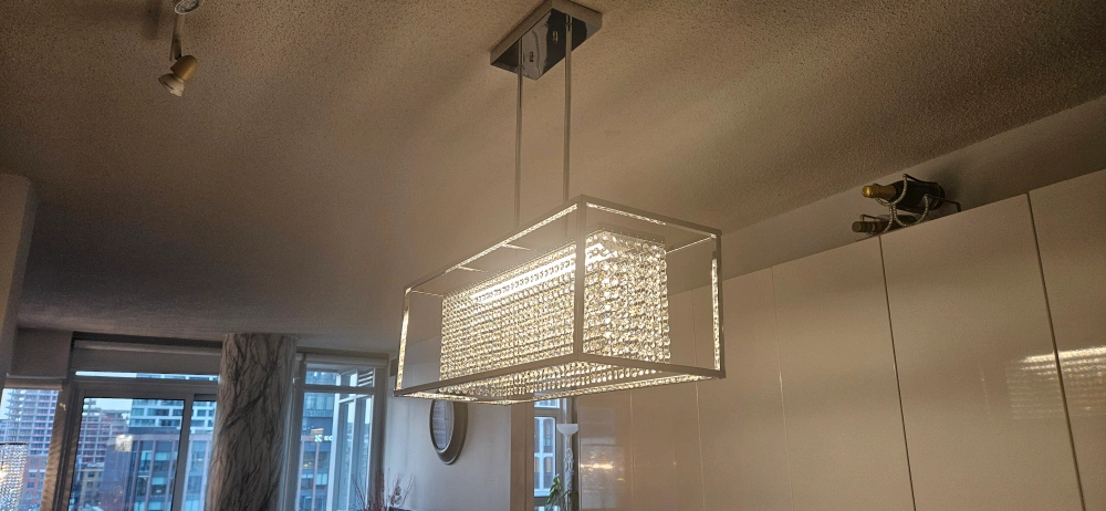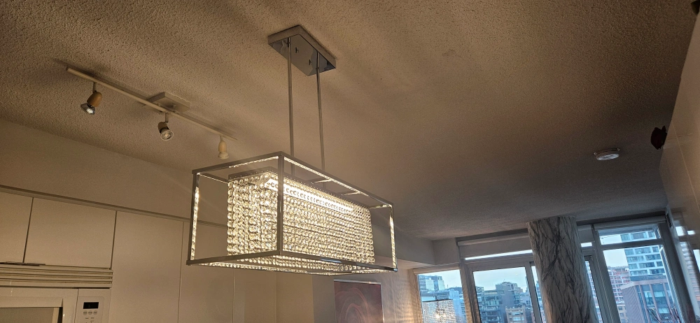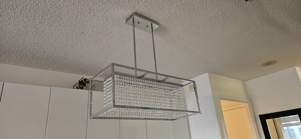 Modern rectangular chandelier. Crystal accents. Chrome finish. Integrated LED lighting. Energy Star certified.