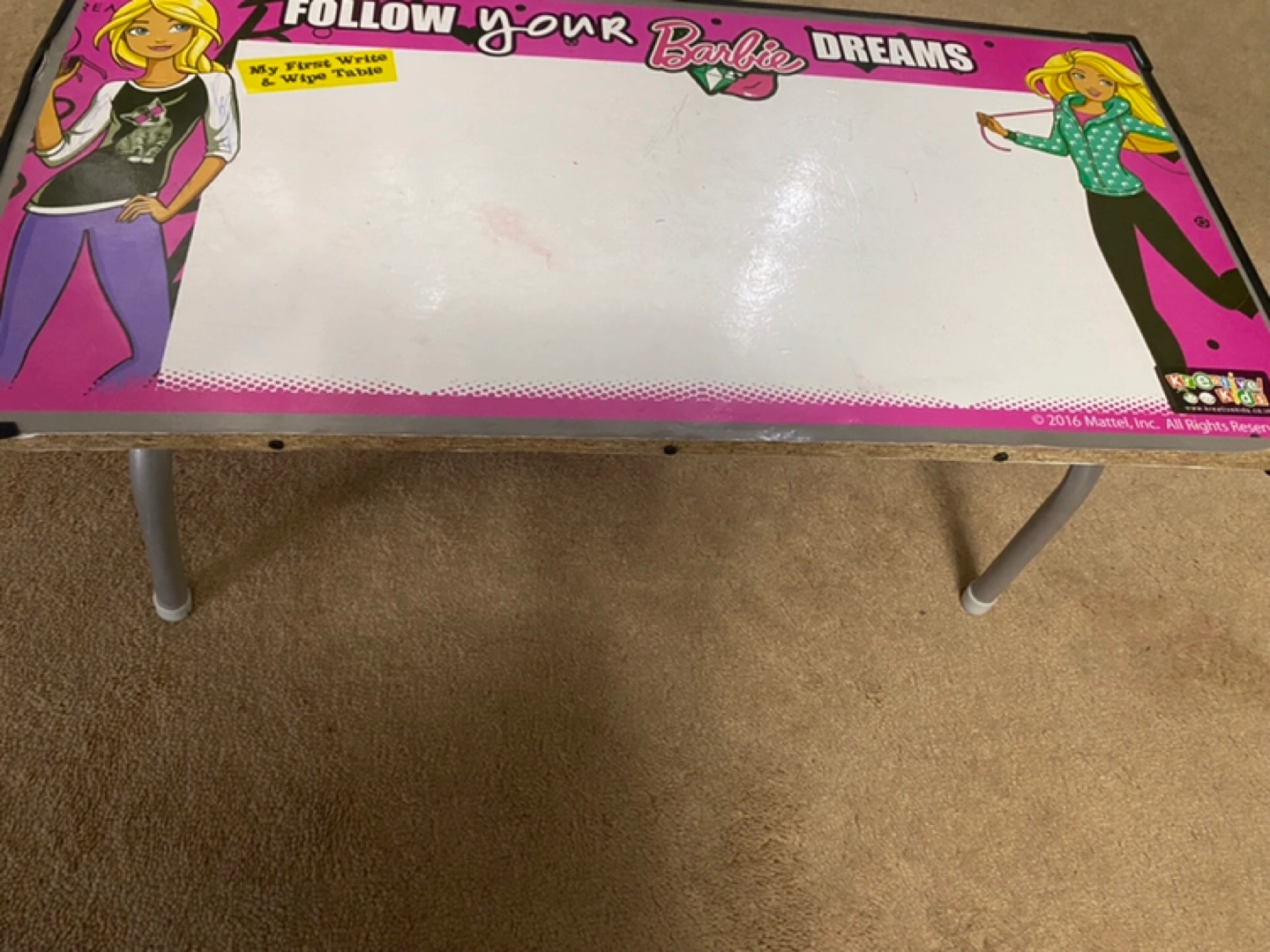 194Portable children's table. Features a write and wipe surface. Barbie themed. Great for creative play.