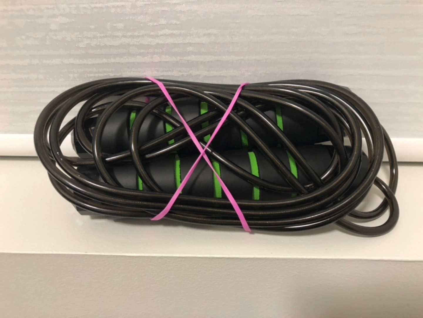 Black jump rope with green accents. Durable, coated wire cable. Great for fitness. (heavy duty and decent size for most people)