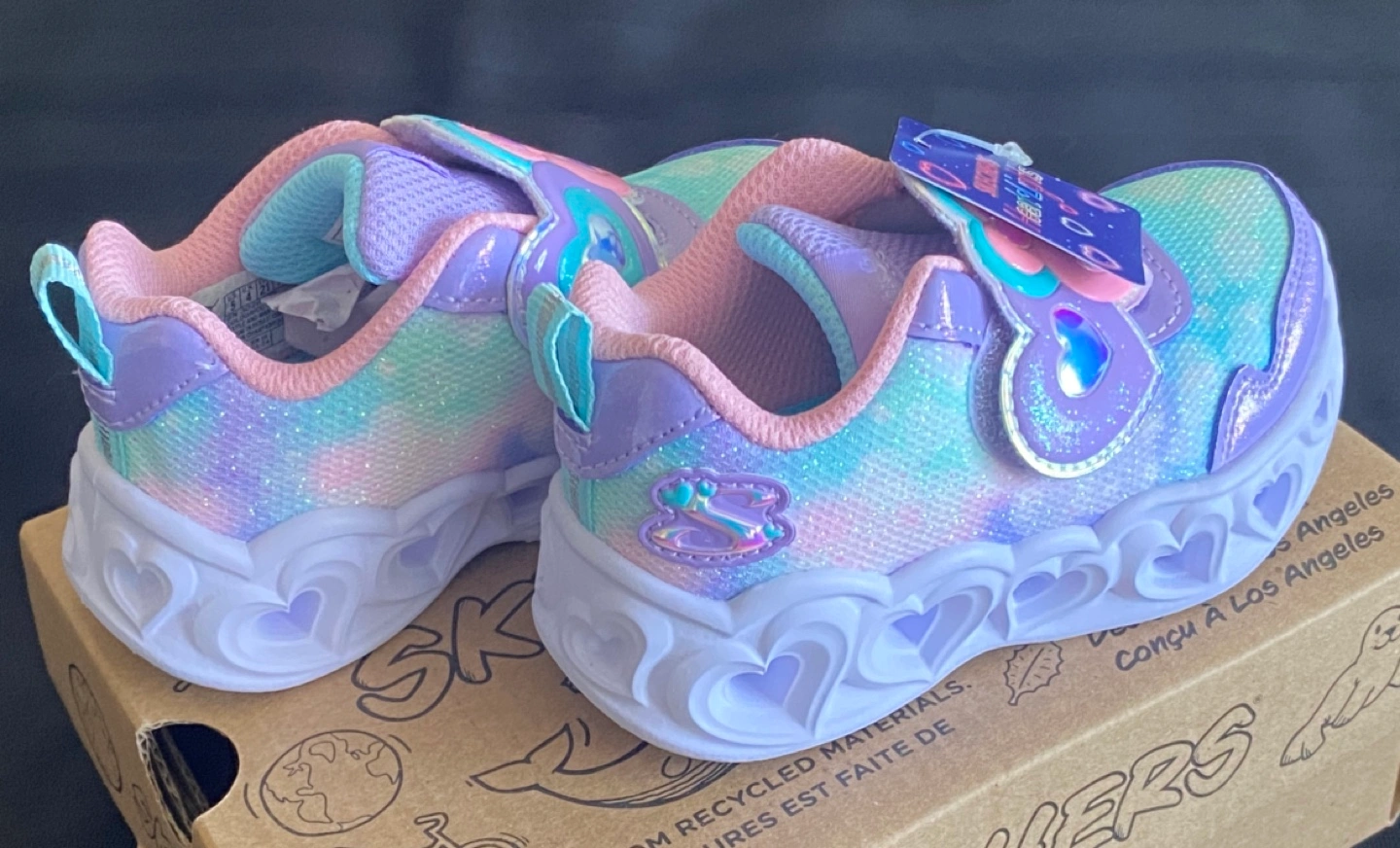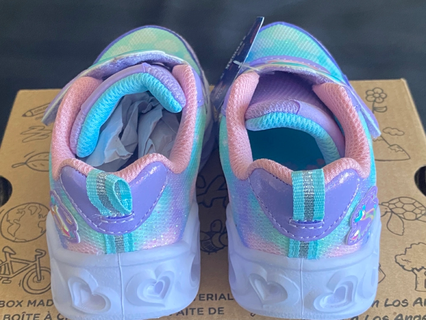 Lightly cushioned toddler sneakers. Purple, pink and light blue pastel colours. Heart details throughout. Light up feature. New in box.