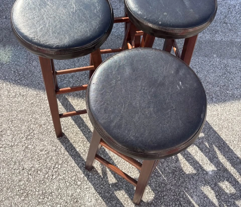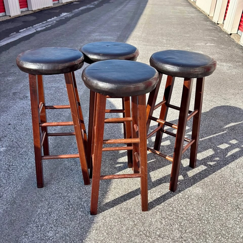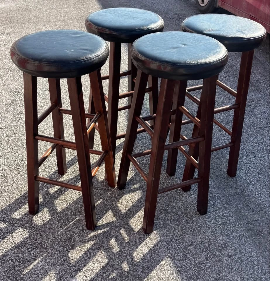 4 sturdy bar stools with dark wood finish, padded seats, and footrests. 31 inches tall, great for counter or bar area.