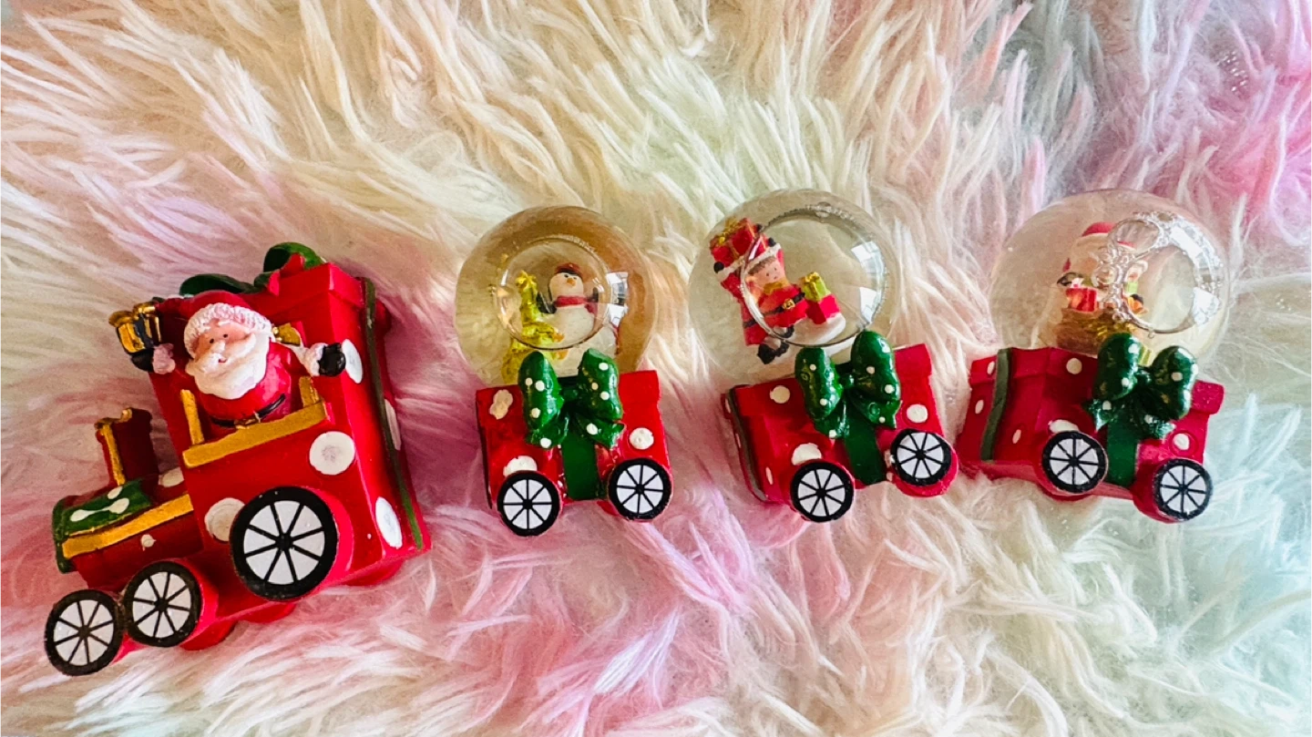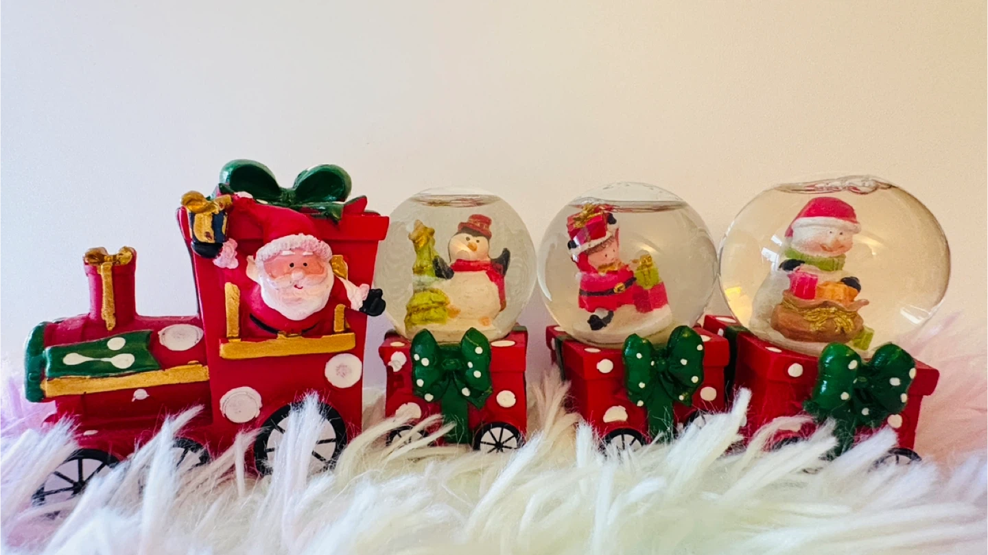 A festive set featuring a red Christmas train carrying Santa and three snow globes. The snow globes contain a snowman, a girl in a hat, and Santa with presents. They're perfect for holiday decor!