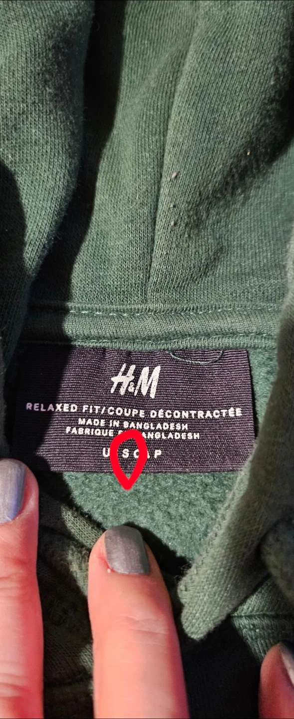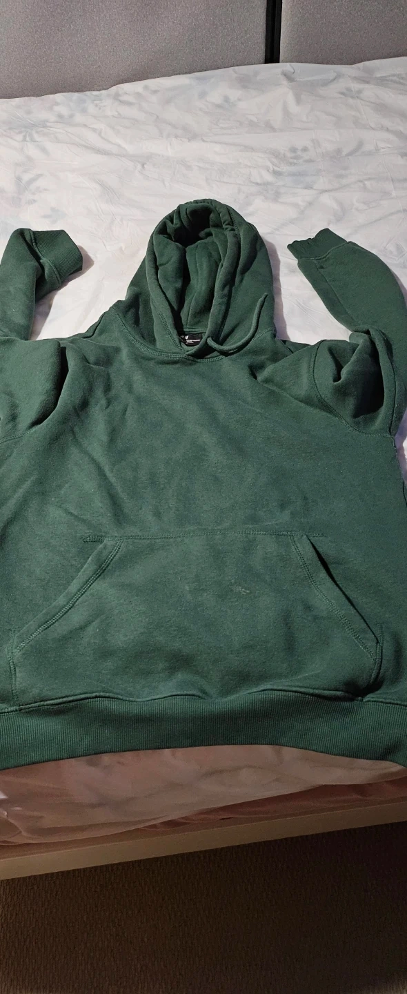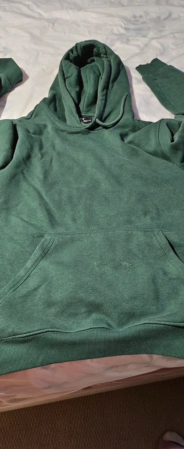 This is an H&M relaxed fit hoodie in a size small. It's a dark green colour. Features a front pouch pocket and a drawstring hood.