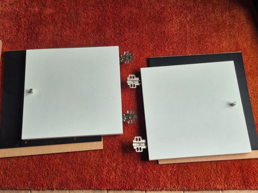 Two sets of IKEA KALLAX insert shelves new with slightly used white doors. Unassembled. Includes hardware except for screws to mount the doors. Perfect for customizing your KALLAX shelving unit.