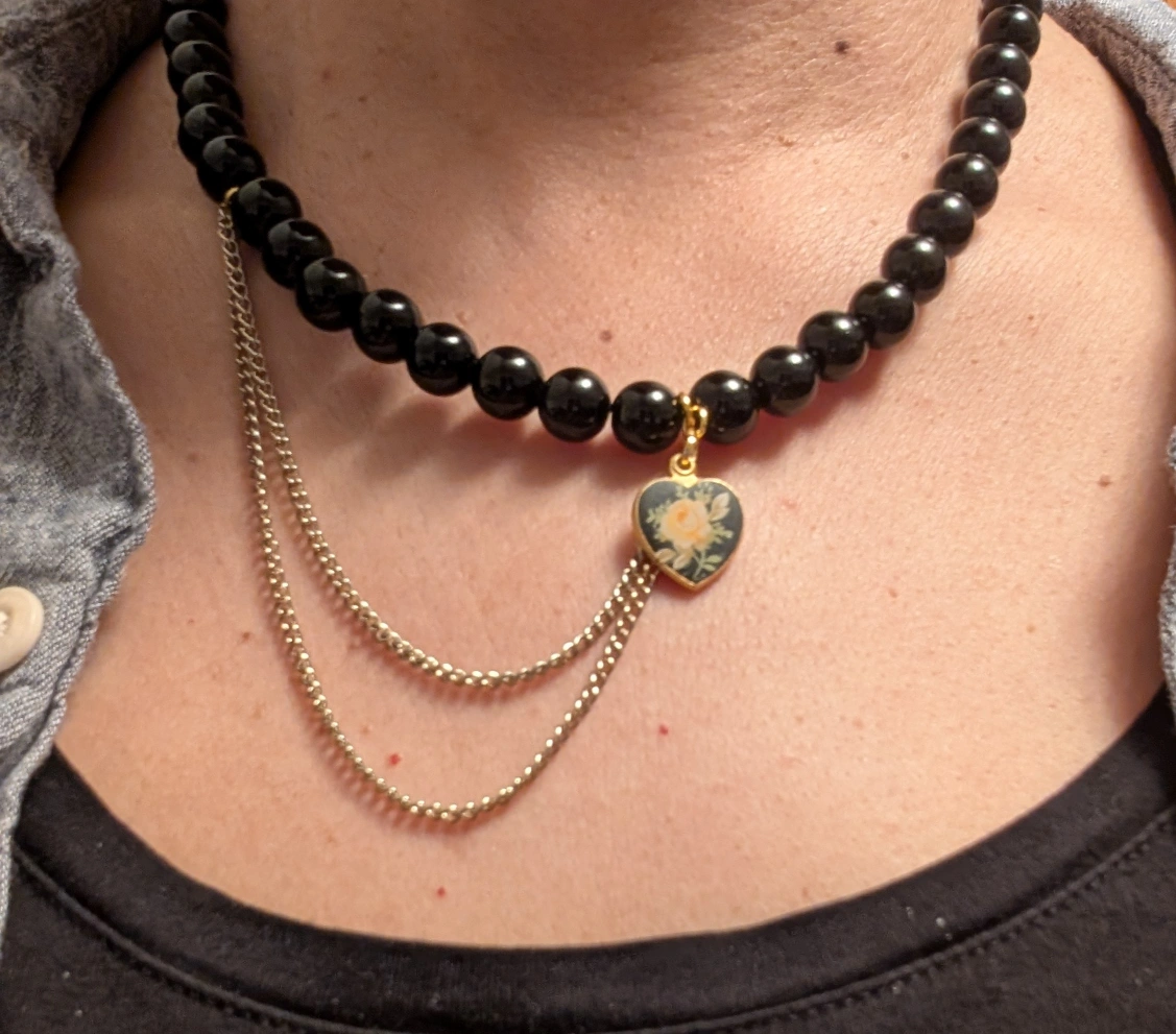 Unique necklace featuring black beads and a gold heart charm with floral design. Double chain detail.
