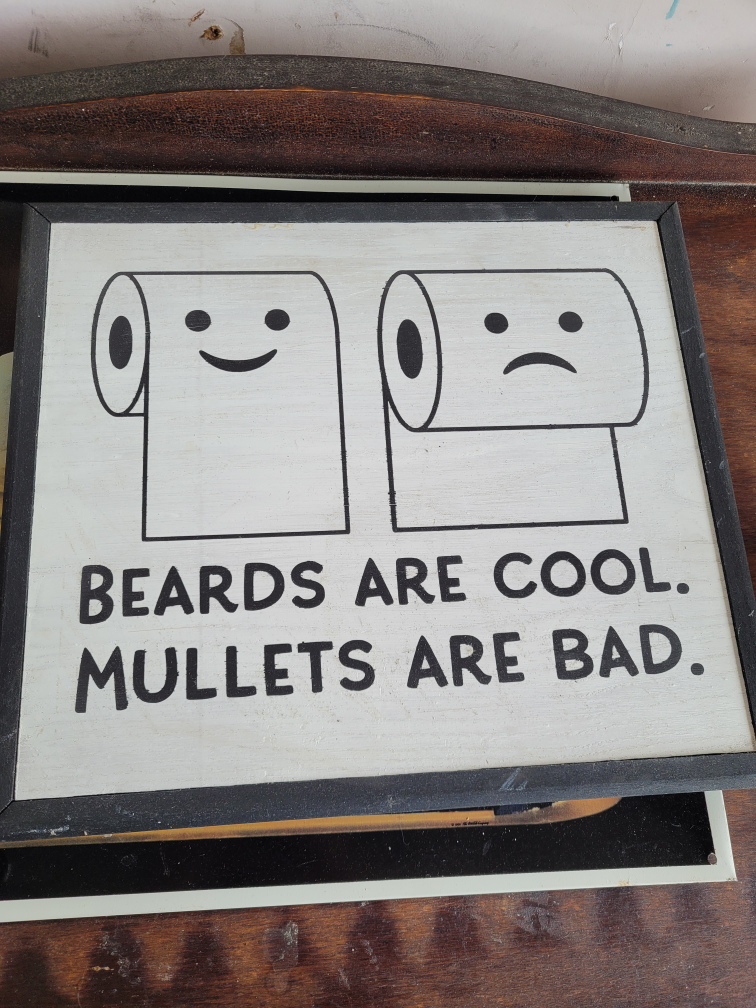 Wooden framed sign featuring two rolls of toilet paper with faces. One happy, one sad. Text reads "BEARDS ARE COOL. MULLETS ARE BAD."