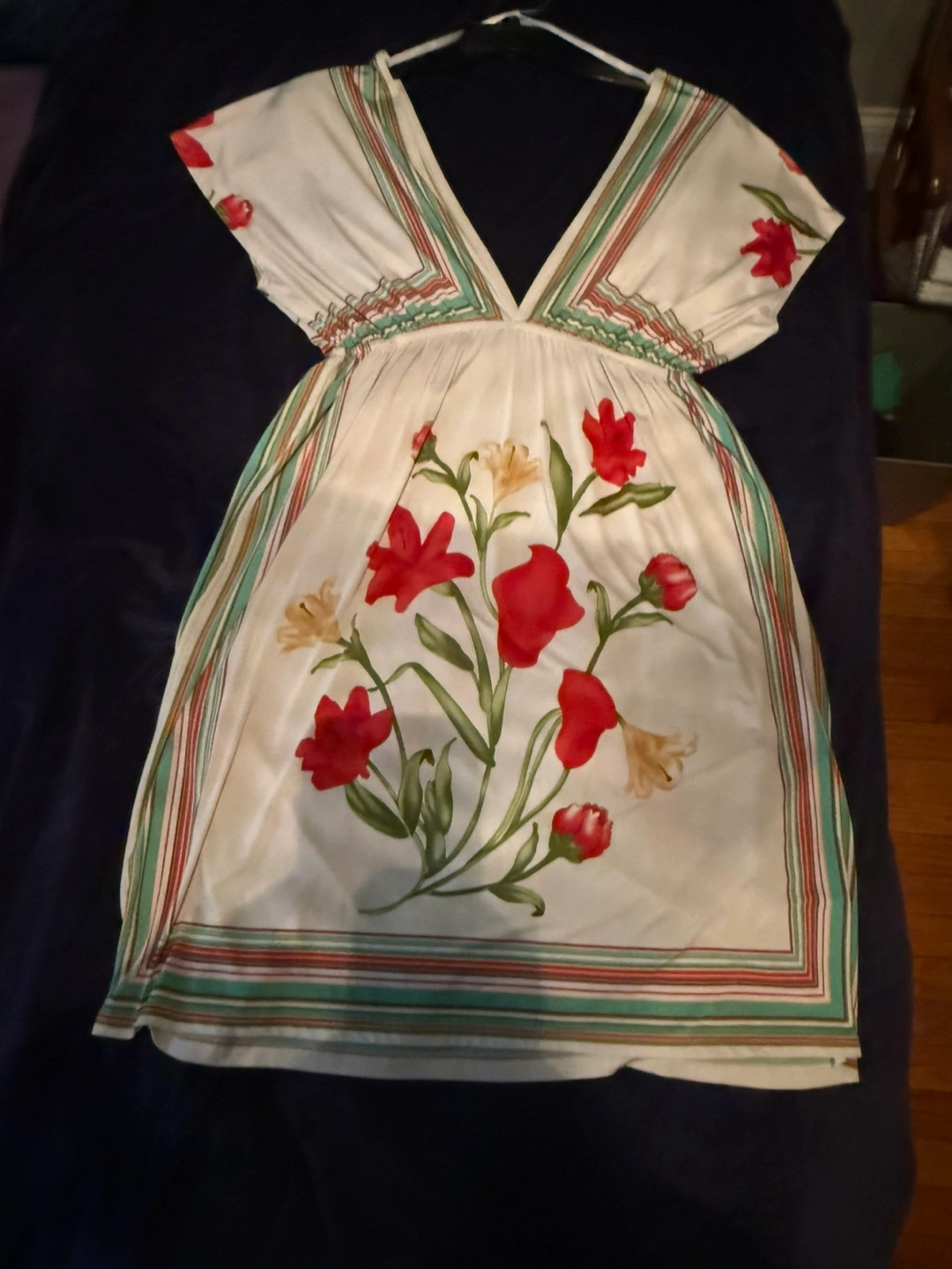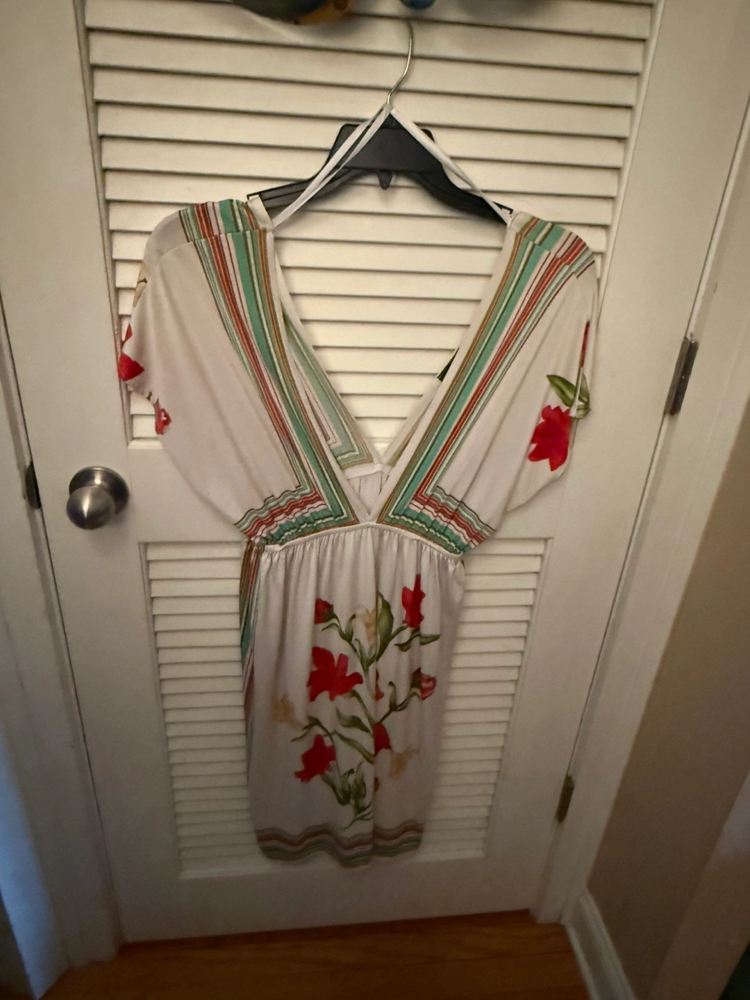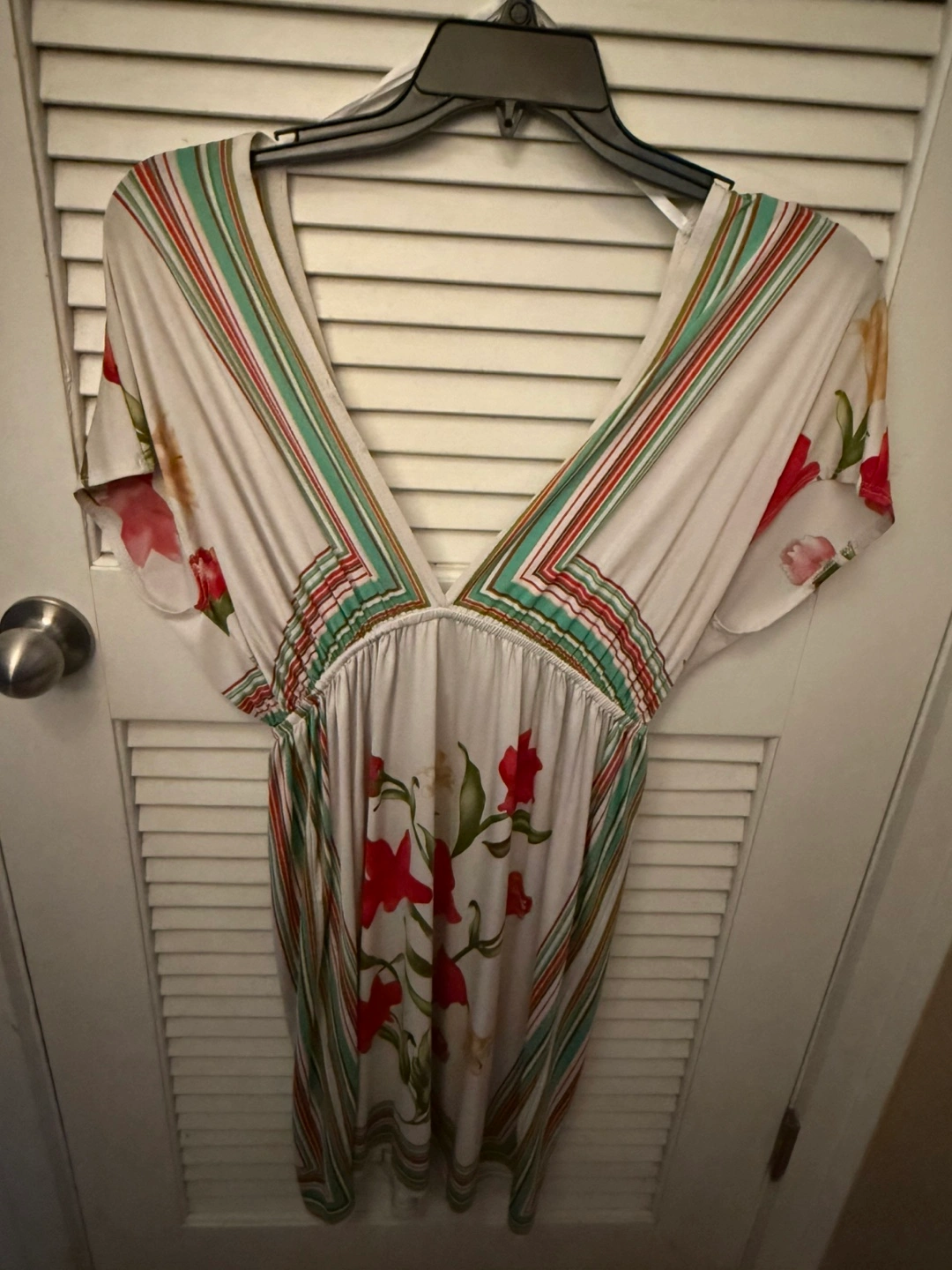 Floral print mini dress. V-neck. Short sleeves. Multicolored stripes. Medium.
