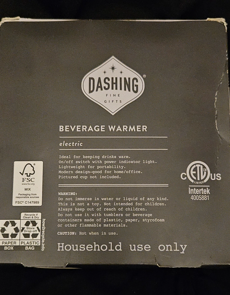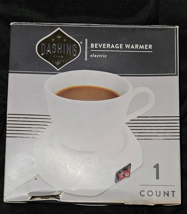 Electric beverage warmer. Keeps drinks warm. On/off switch with power indicator light. Lightweight. Perfect for home/office. Pictured cup not included. Household use only.