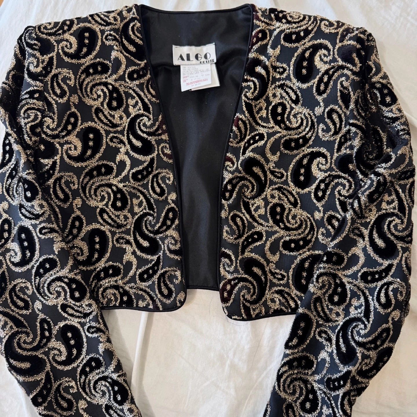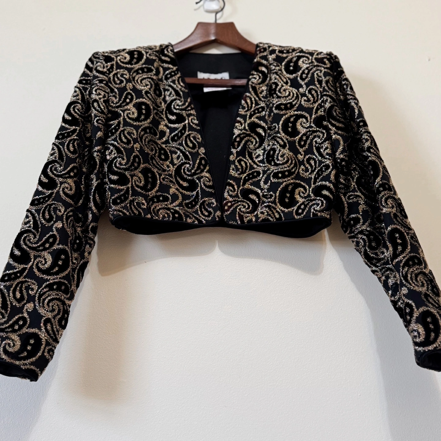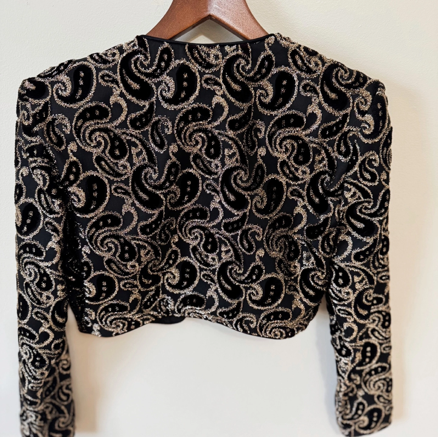A bold and glamorous vintage cropped jacket featuring a luxurious paisley pattern with velvet texture and metallic shimmer. This eye-catching piece is perfect for special occasions or adding a dramatic touch to your evening look. The shoulder pads give a structured silhouette, while the open front design keeps it effortlessly chic.