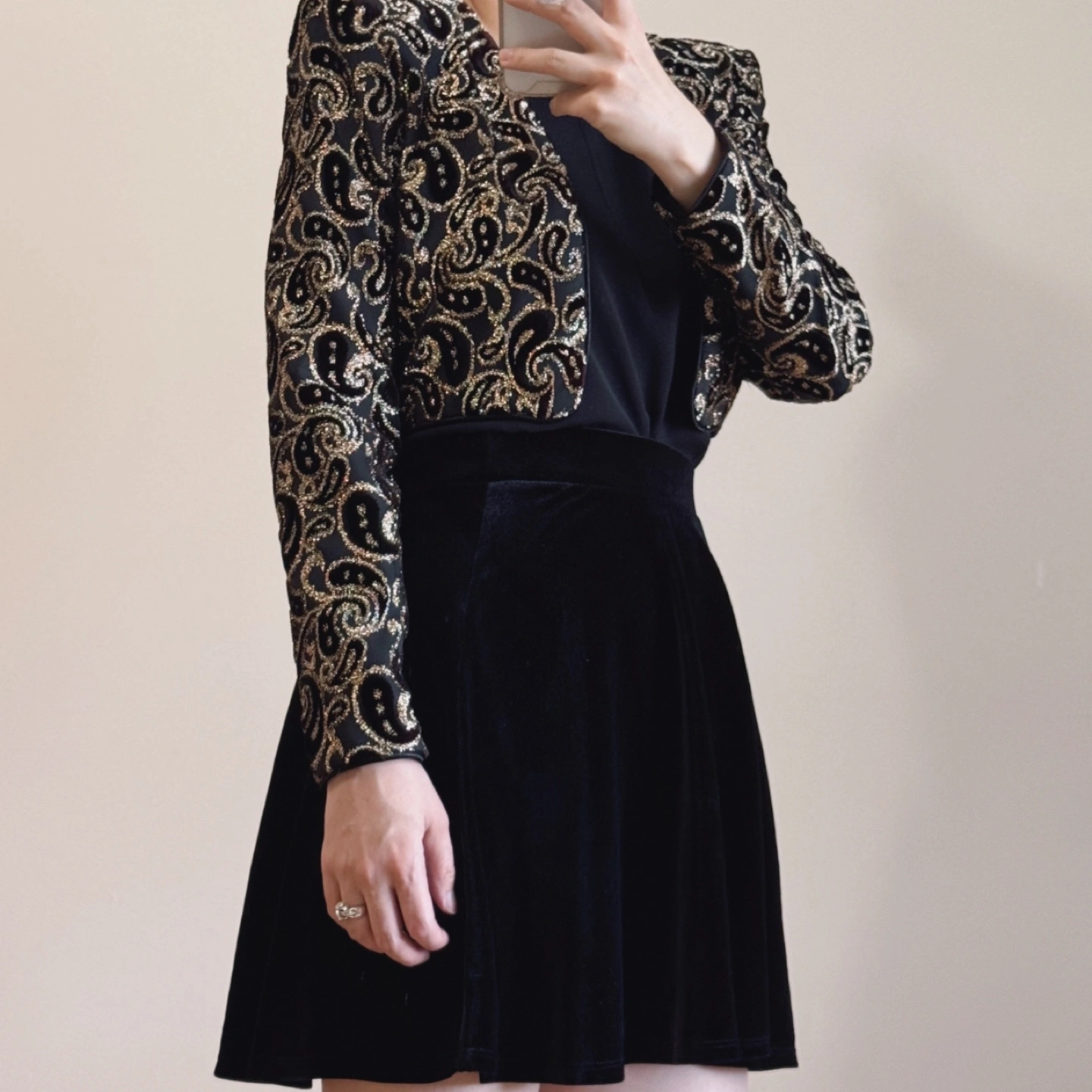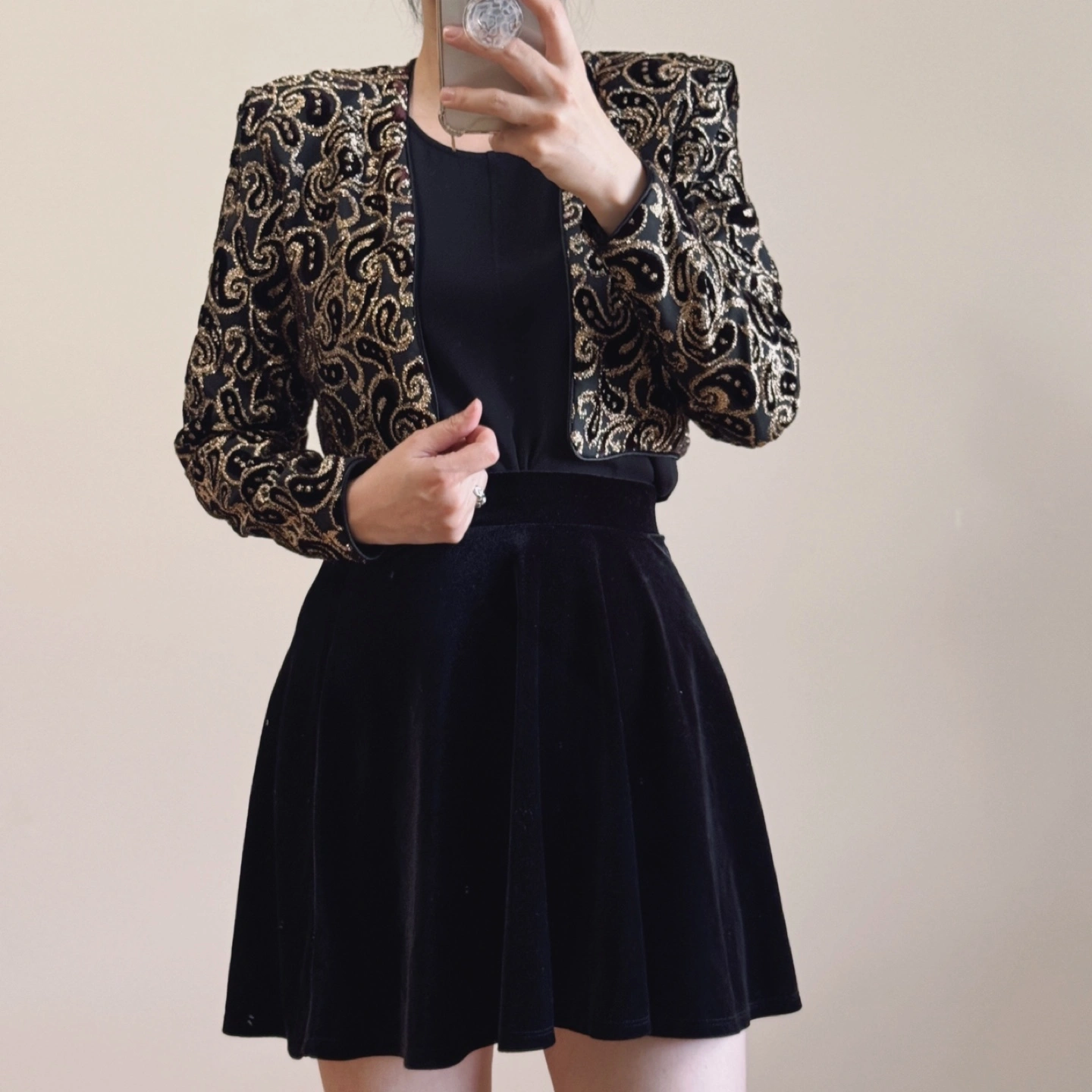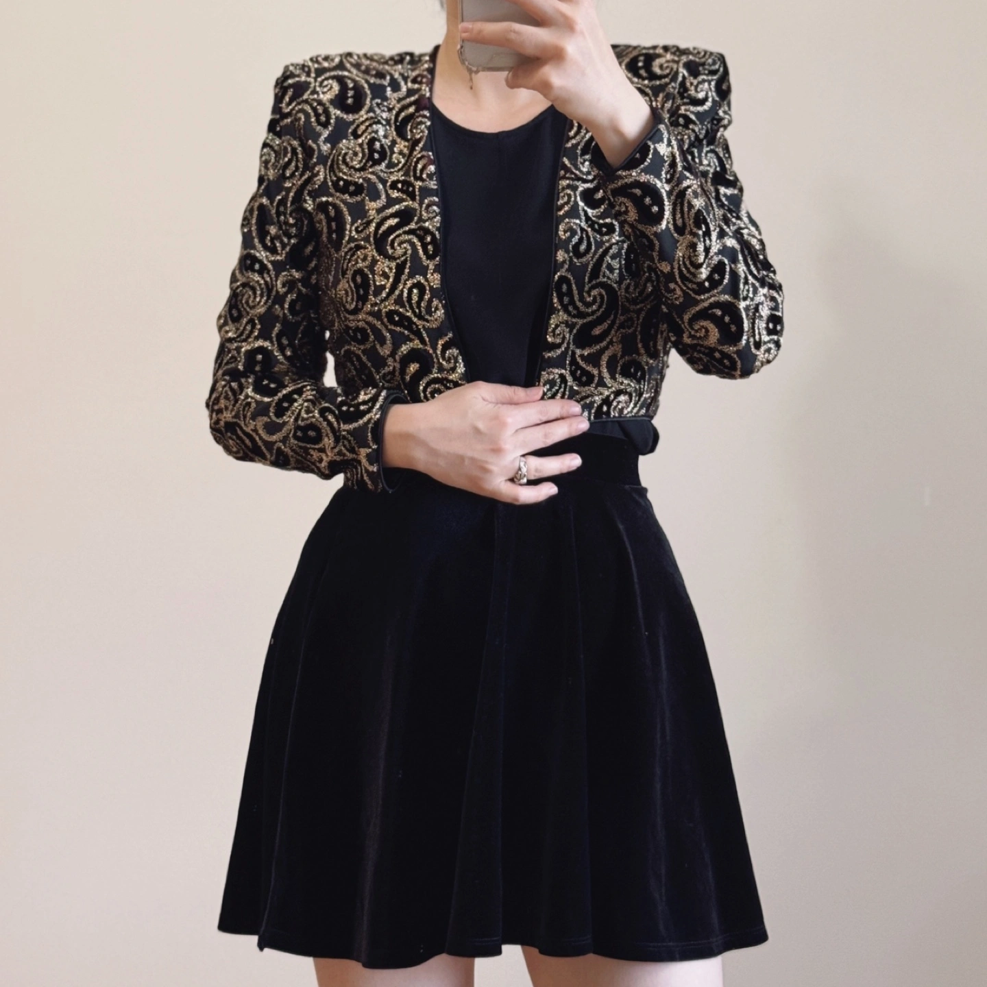 A bold and glamorous vintage cropped jacket featuring a luxurious paisley pattern with velvet texture and metallic shimmer. This eye-catching piece is perfect for special occasions or adding a dramatic touch to your evening look. The shoulder pads give a structured silhouette, while the open front design keeps it effortlessly chic.