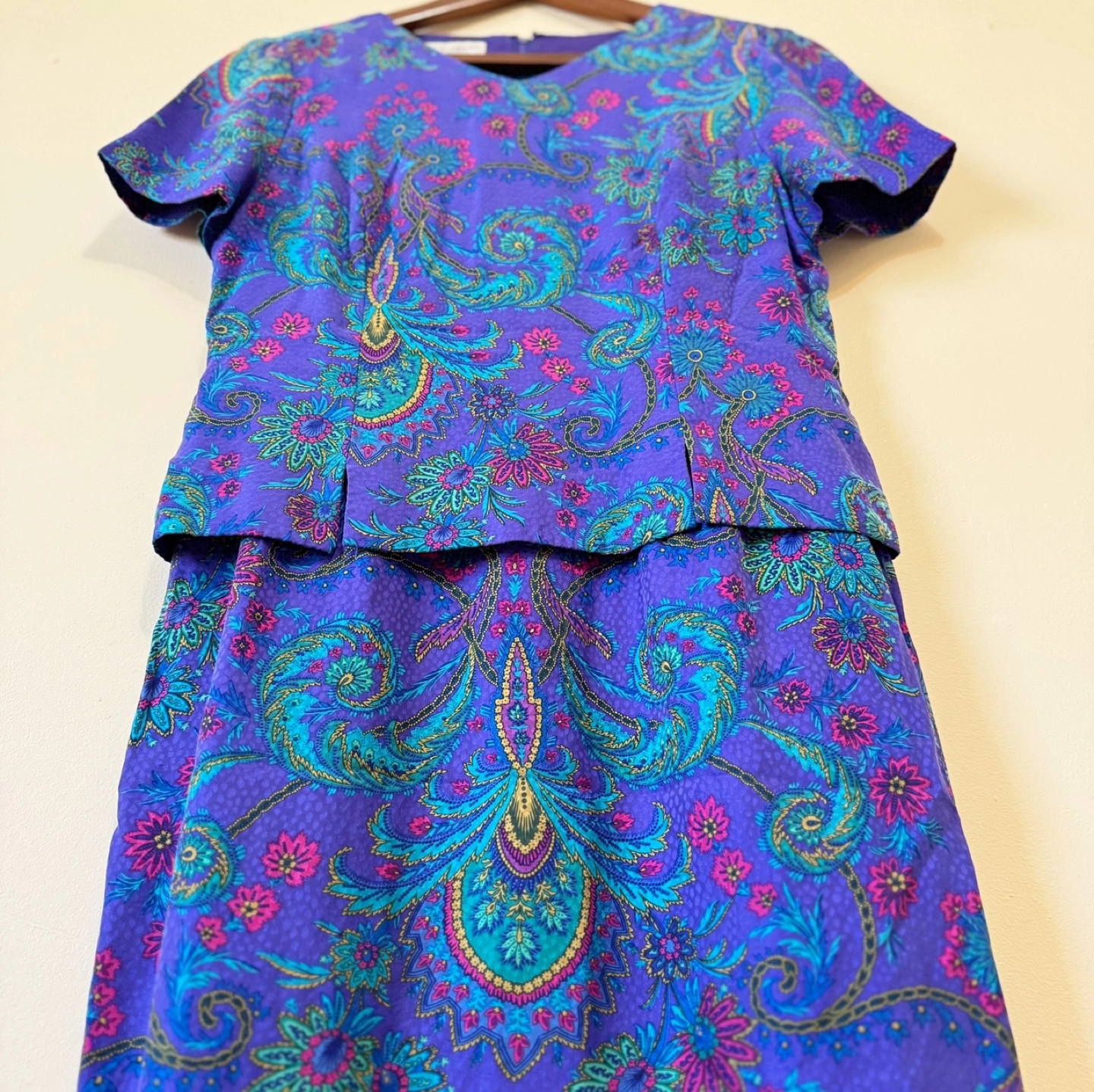 A beautiful vintage dress from Maggy London Petites, crafted from 100% silk. This two-piece-look dress features a vibrant paisley and floral pattern with an elegant silhouette. The top layer creates a cropped illusion, adding a unique dimension to the classic shift dress shape.