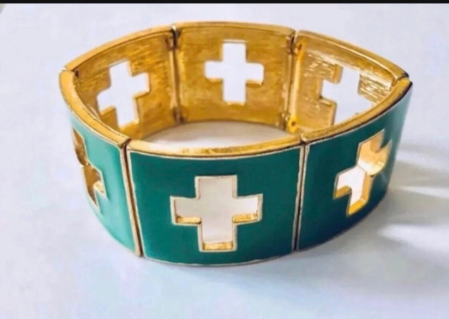 Gold tone bracelet. Green enamel and cut-out crosses. Flexible hinged design. Unique statement piece.