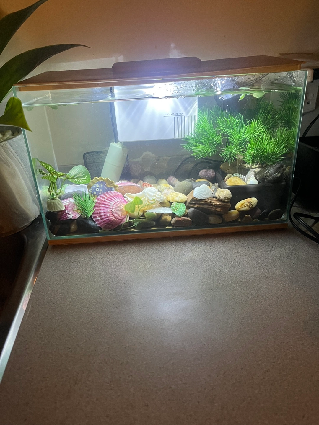 Medium aquarium kit, includes LED light and filter. Features decorative rocks, shells, and plants. Perfect for a desktop or shelf.