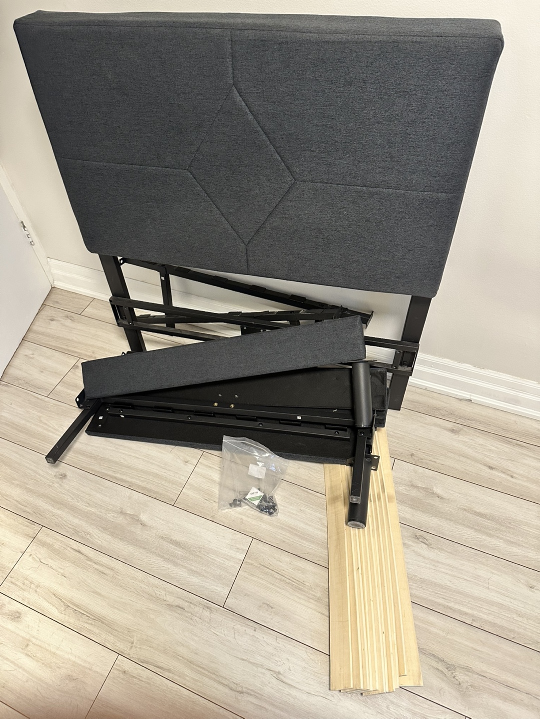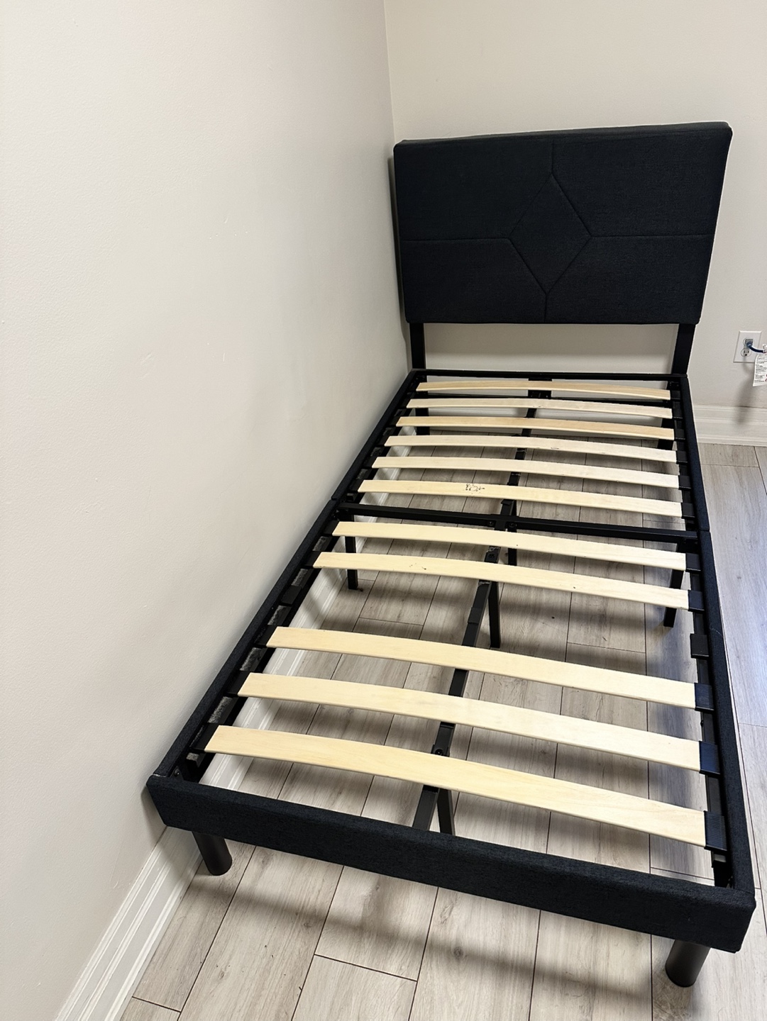 1 / 21 / 2Buy & SellTwin-size bed frame with headboardTwin-size bed frame with headboard$25Dark grey fabric headboard, black metal frame, wooden slats. Easy assembly.ConditionLike newWHERE TO MEETThe East MallView MapSELLERverifiedChidiIslington49745 reviews5 chats·0 favorites·42 viewsSEND CHAT TO SELLERHi Chidi! I’m interested in your listing.Hi Chidi! I’m interested in your listing.Get the Karrot app to chatSign In to chat