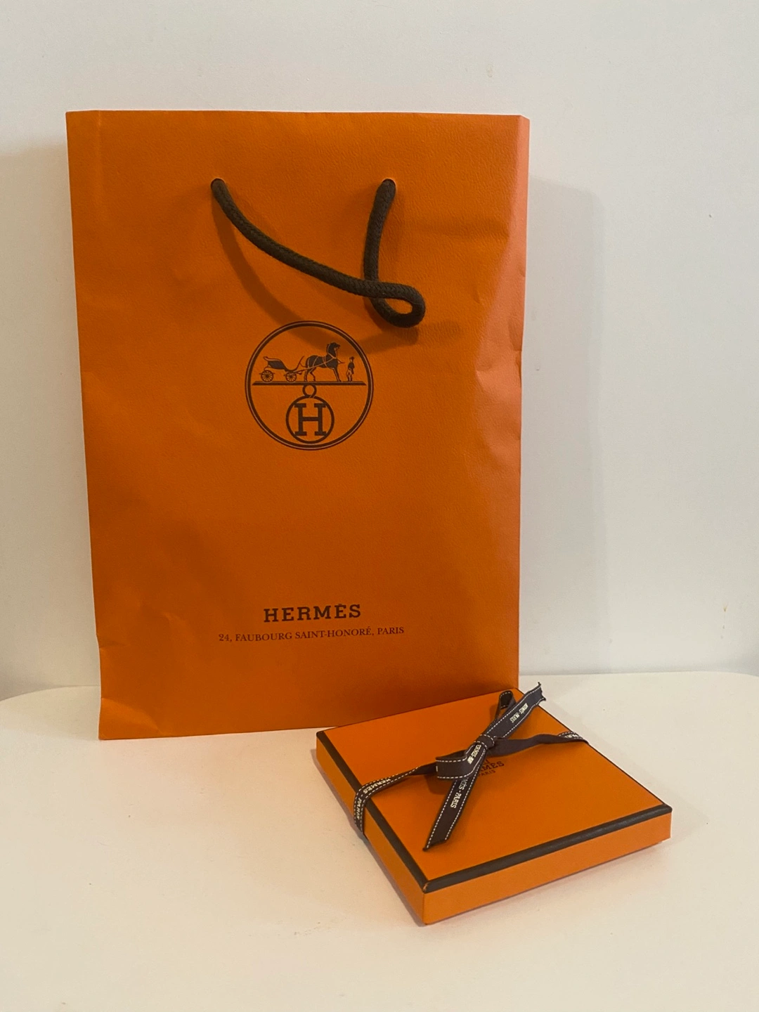 Authentic Hermes orange box and shopping bag. Perfect for gifting or storage.