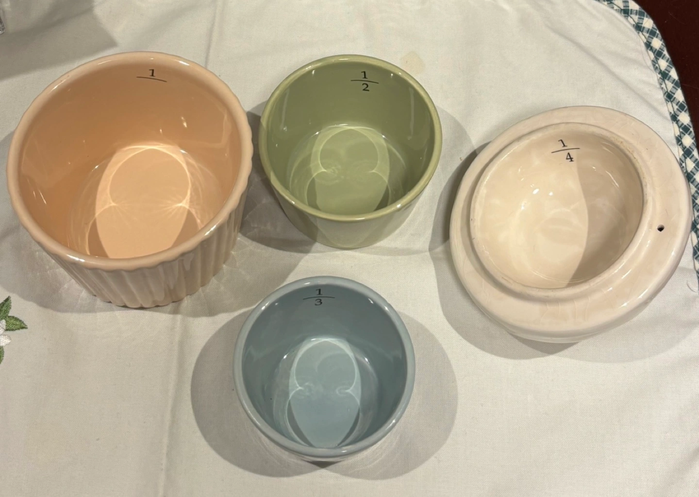 Charming ceramic measuring cup cake measuring cup. Includes four small measuring cups. Perfect for kitchen décor or baking supplies. Gently used, excellent condition.