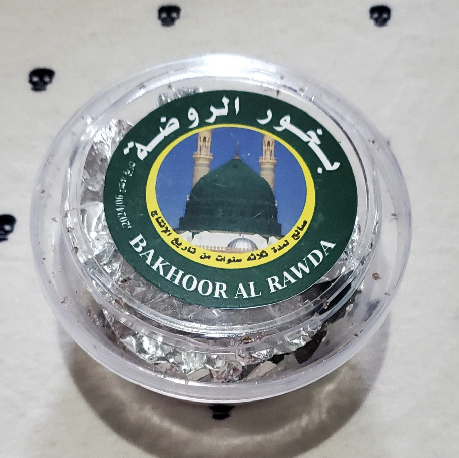 Bakhoor Al Rawda incense in a clear plastic container. Sealed with foil. Burn the bakhoor and your house will smell good forever.