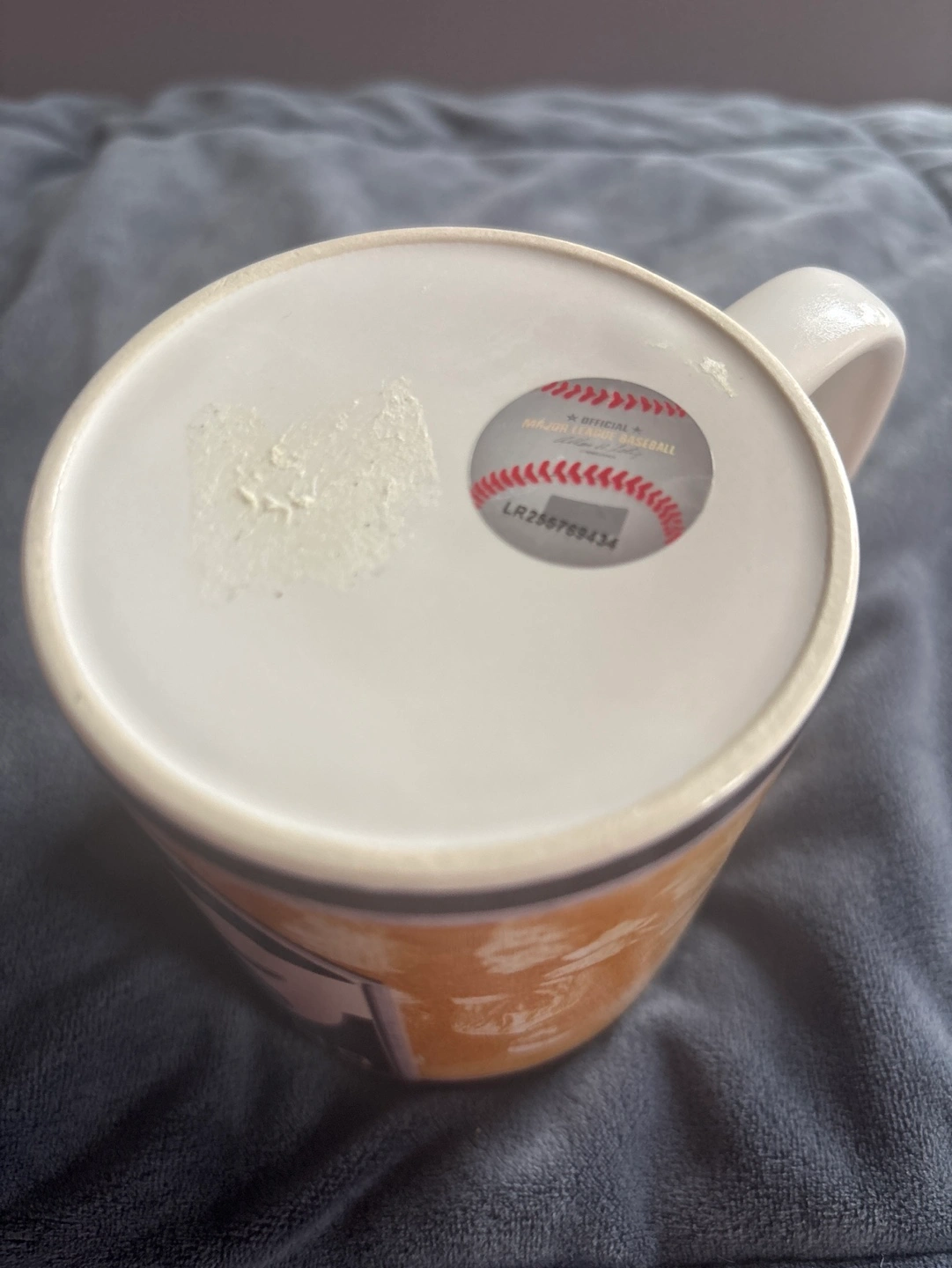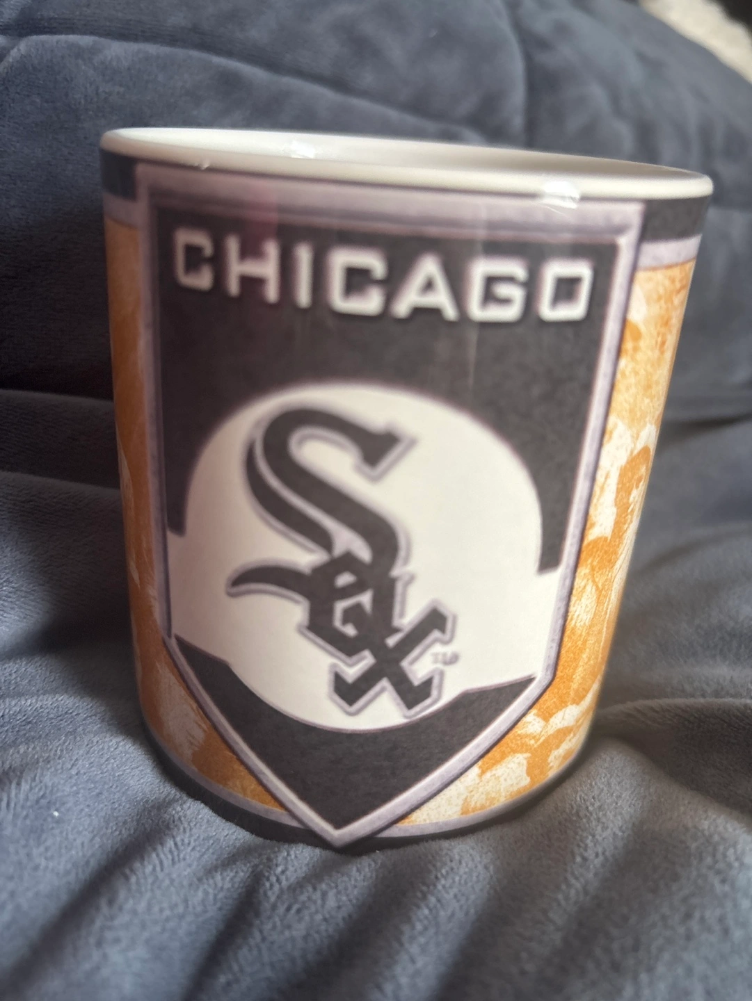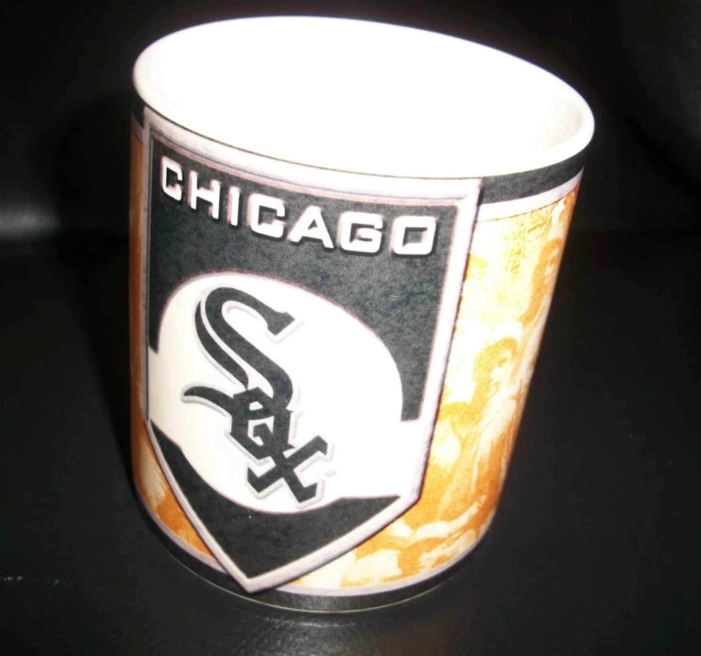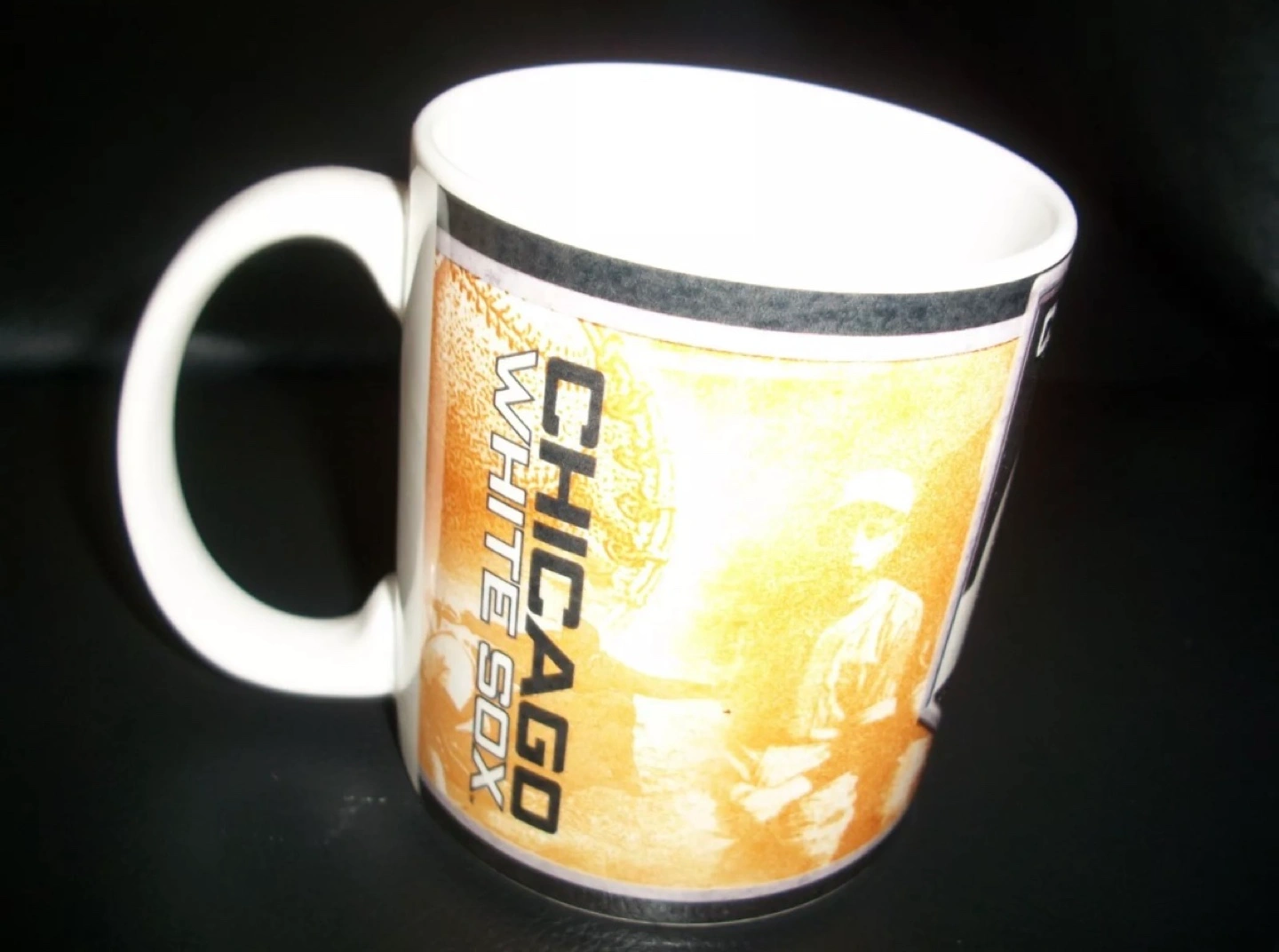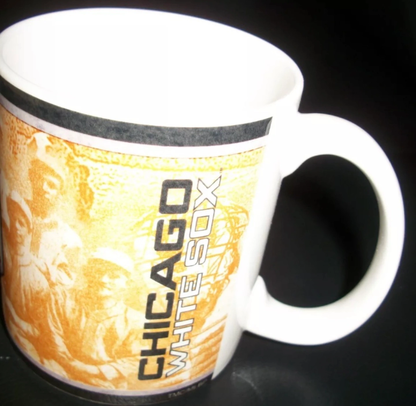 White ceramic mug. Features sepia-toned images and the Chicago White Sox logo. Great for White Sox fans. Shows some minor wear. In good condition.