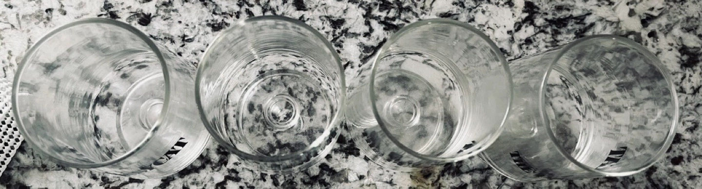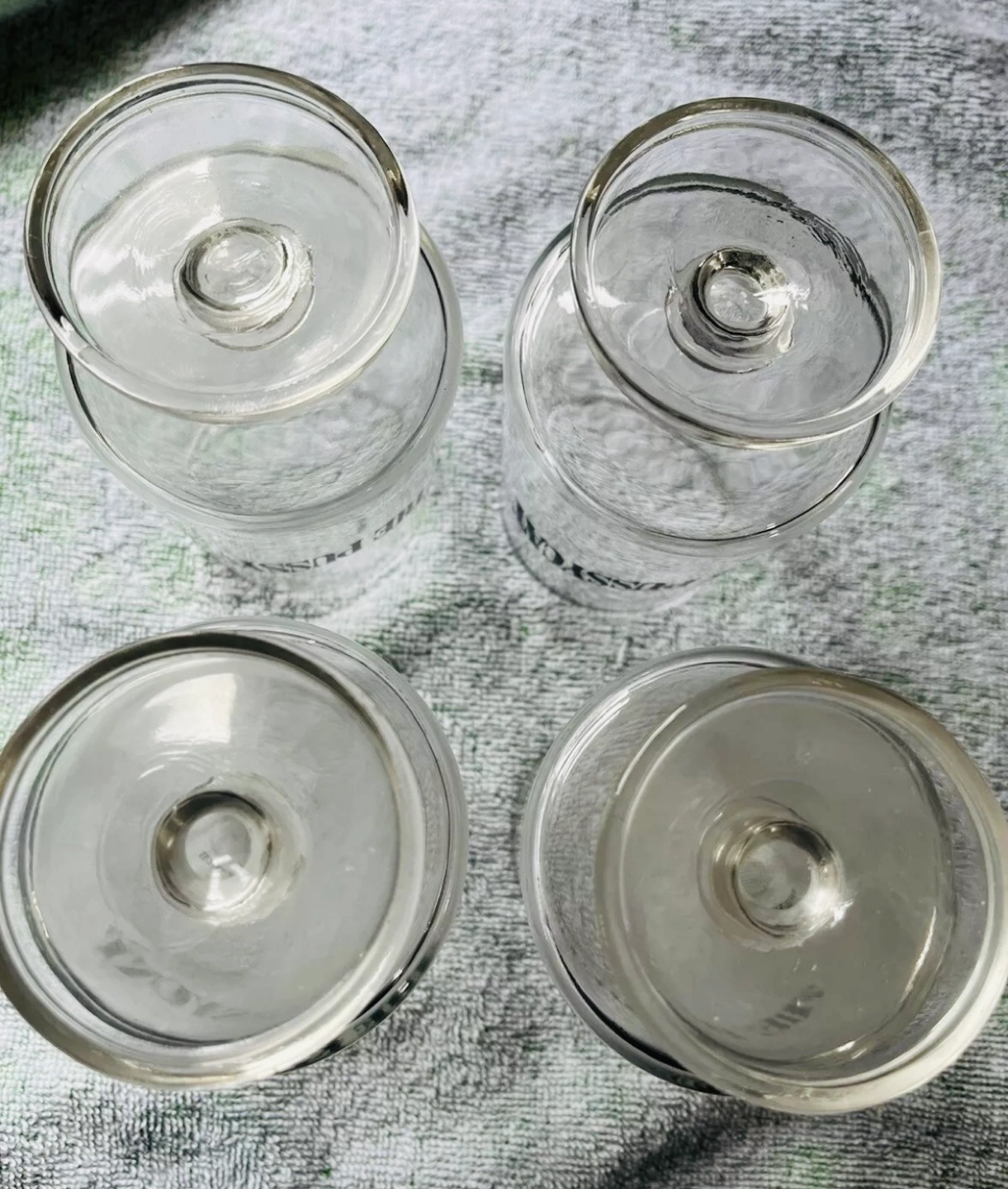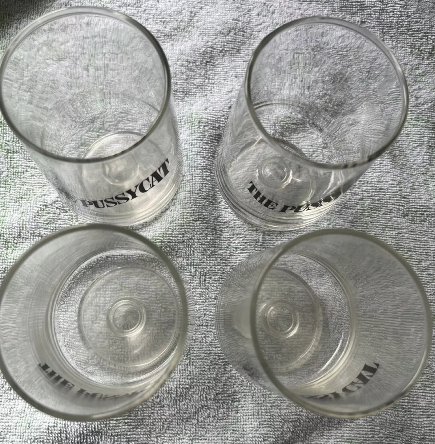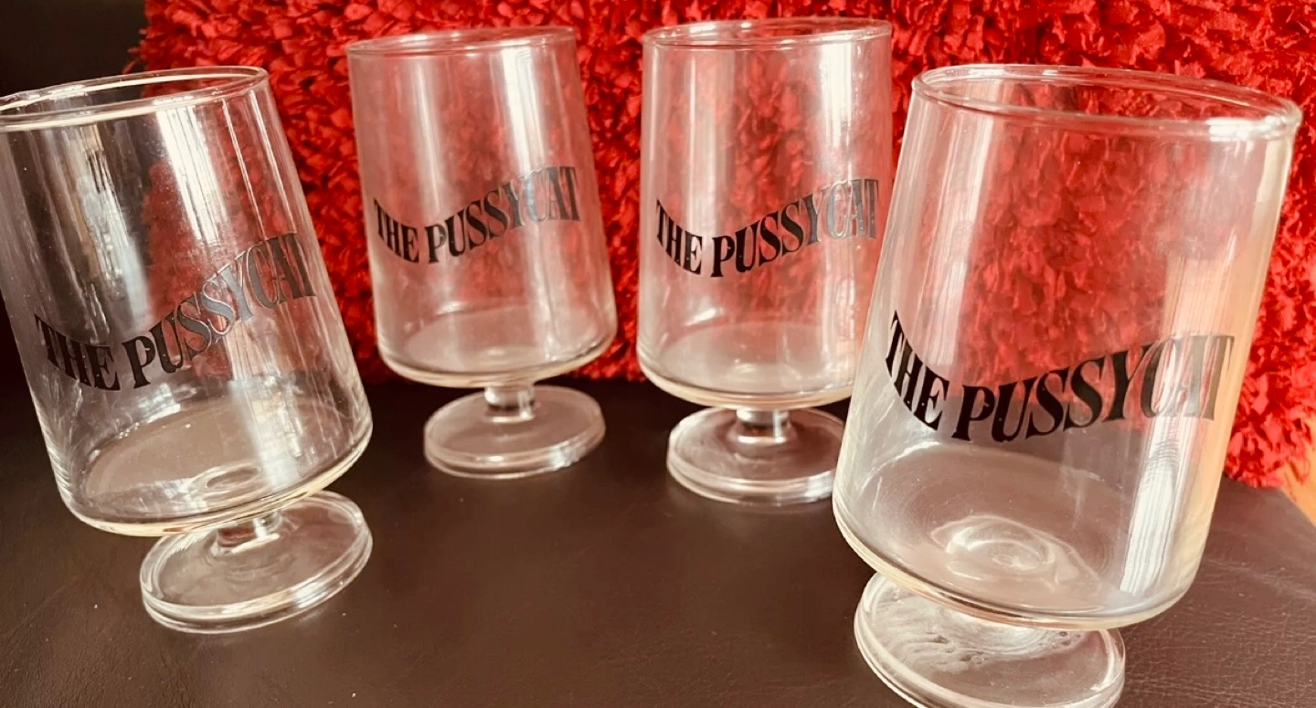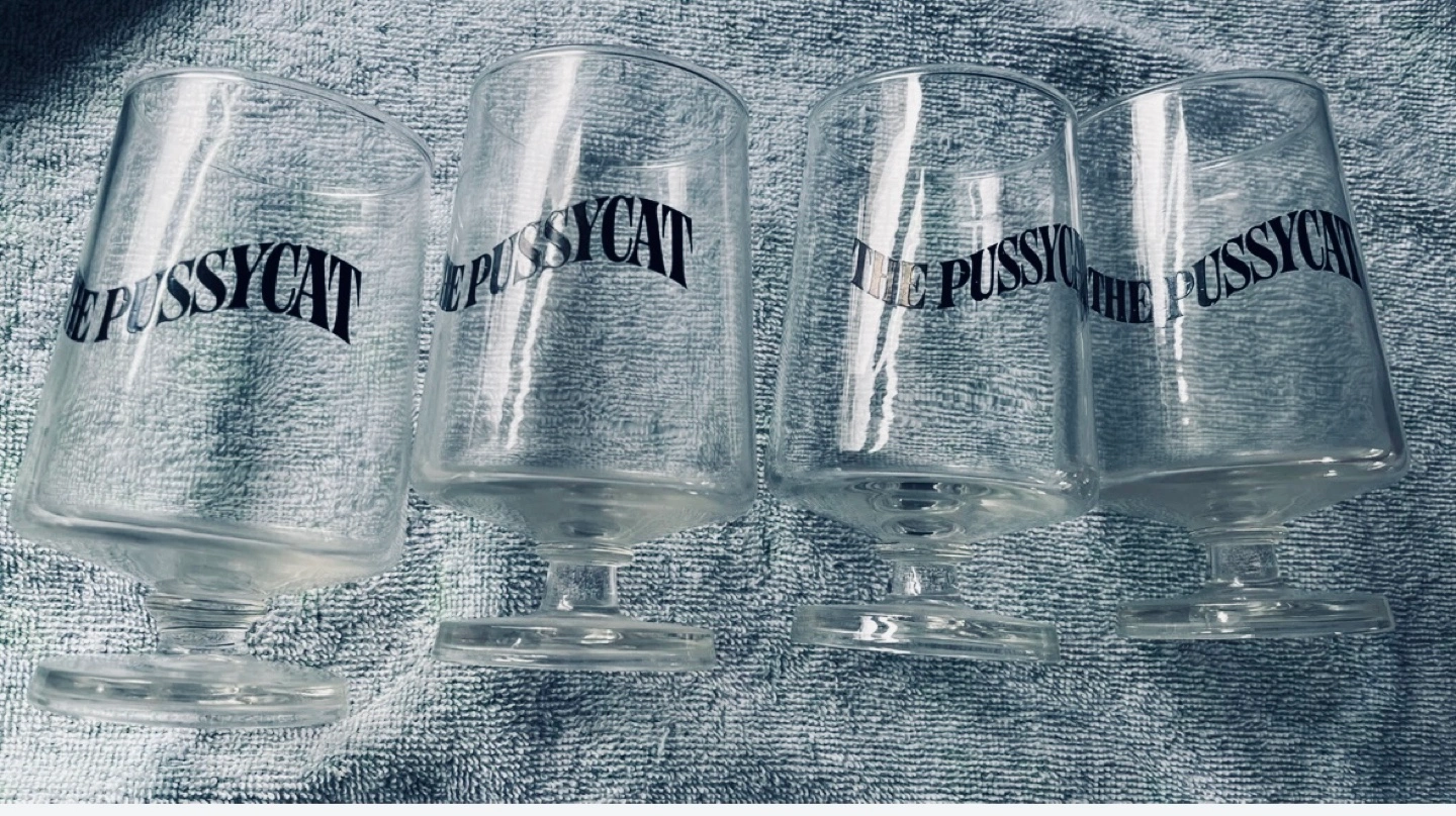 Vintage Four clear stemmed glasses. Each glass features The Pussycat printed on the front. They’ve never been used.