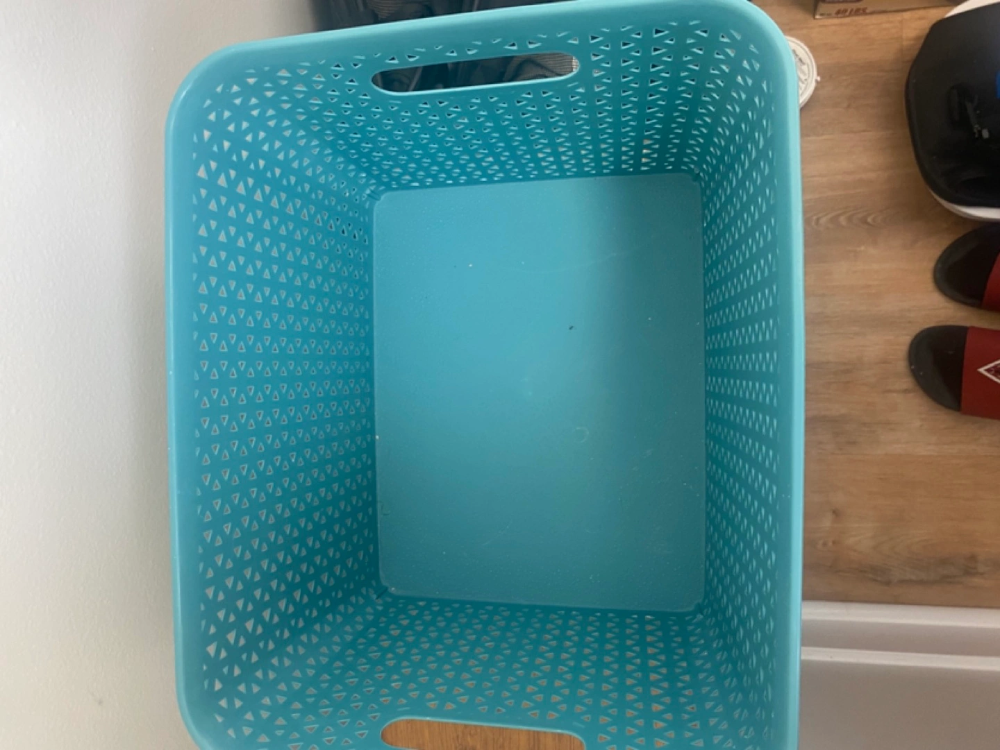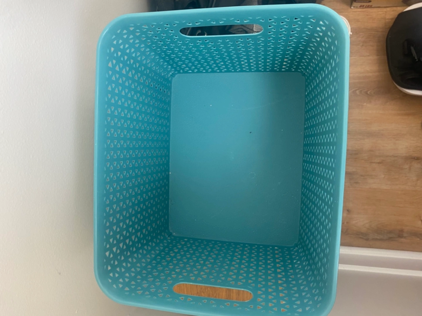 Lightweight plastic storage basket. Teal color. Cutout triangle pattern. Two small handles. Good for organizing.