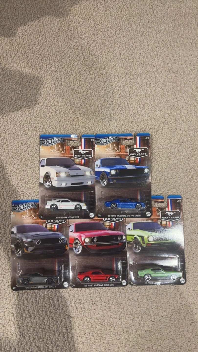 Five collectible Hot Wheels Ford Mustang cars. Silver series. Includes various models and years.