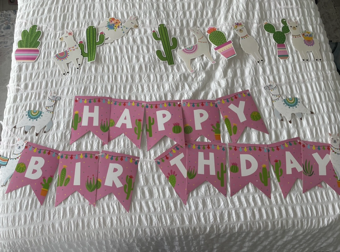 Pink Happy Birthday banner. Features llamas/alpacas, cacti, and colourful accents. Perfect for a fiesta-themed birthday party. 3 separate banners.