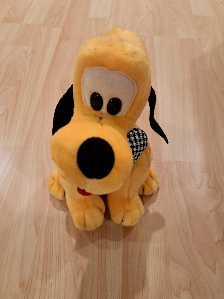 Adorable vintage Pluto plush. Soft yellow fur, black ears and nose. Features a houndstooth bow tie. Collectible item, great for Disney fans.