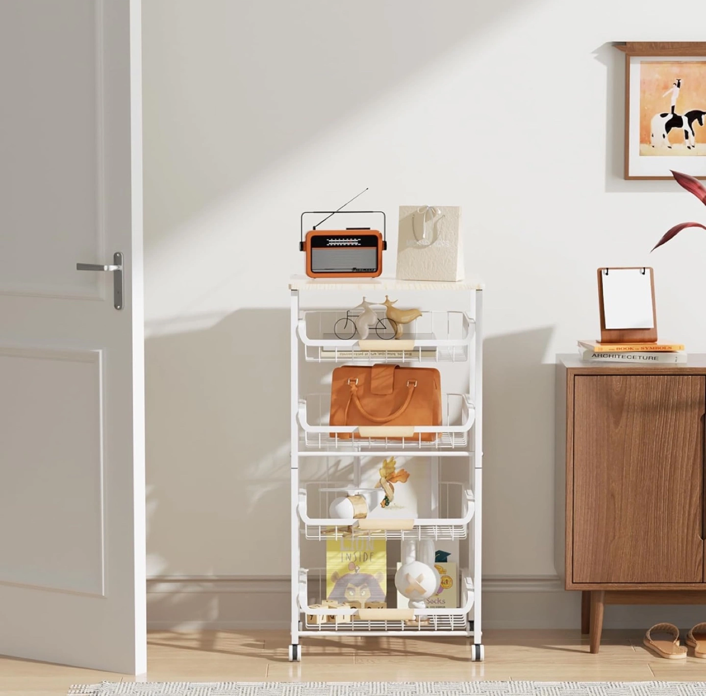 White 4-Tier Rolling Storage Cart with Wooden Top