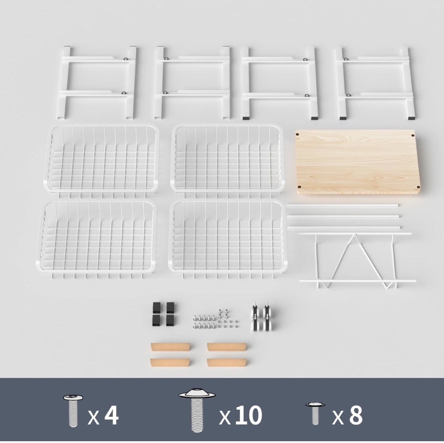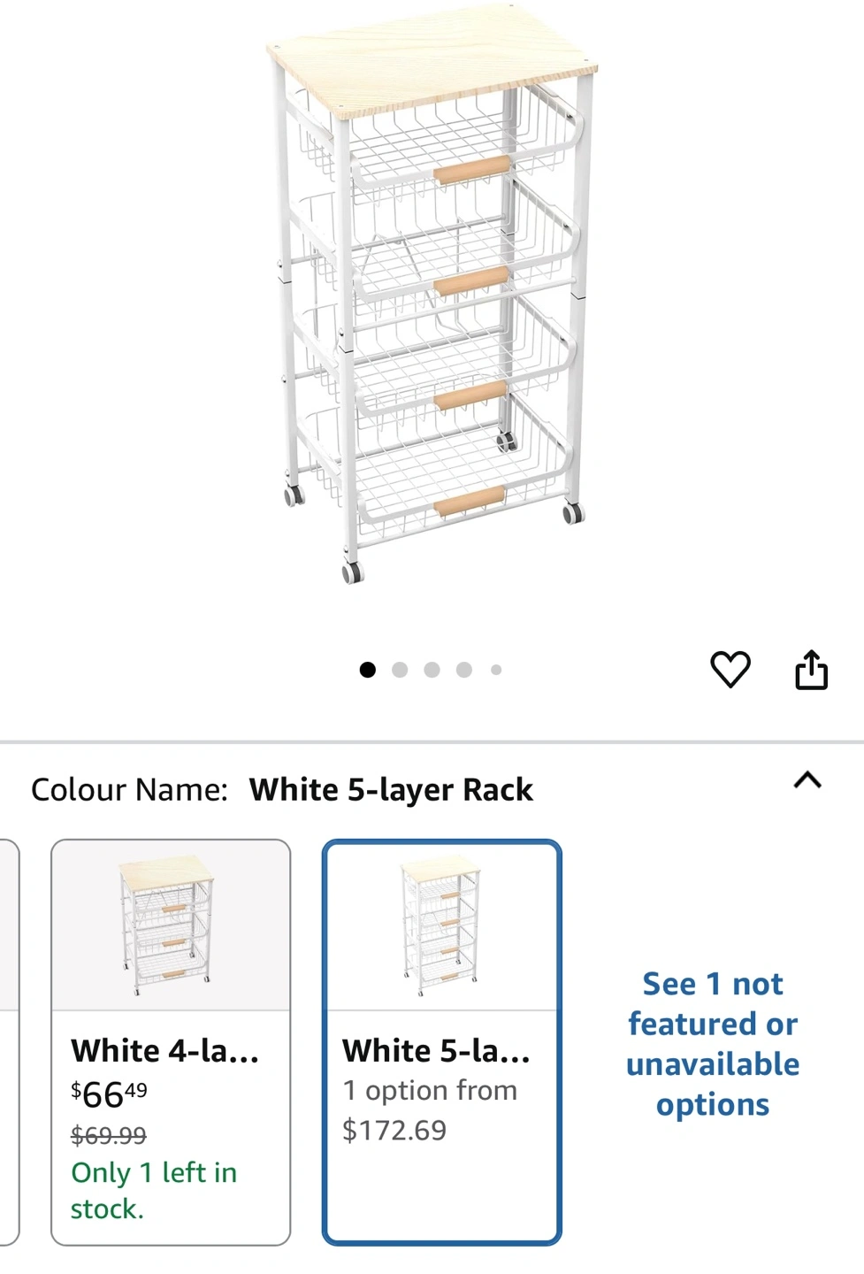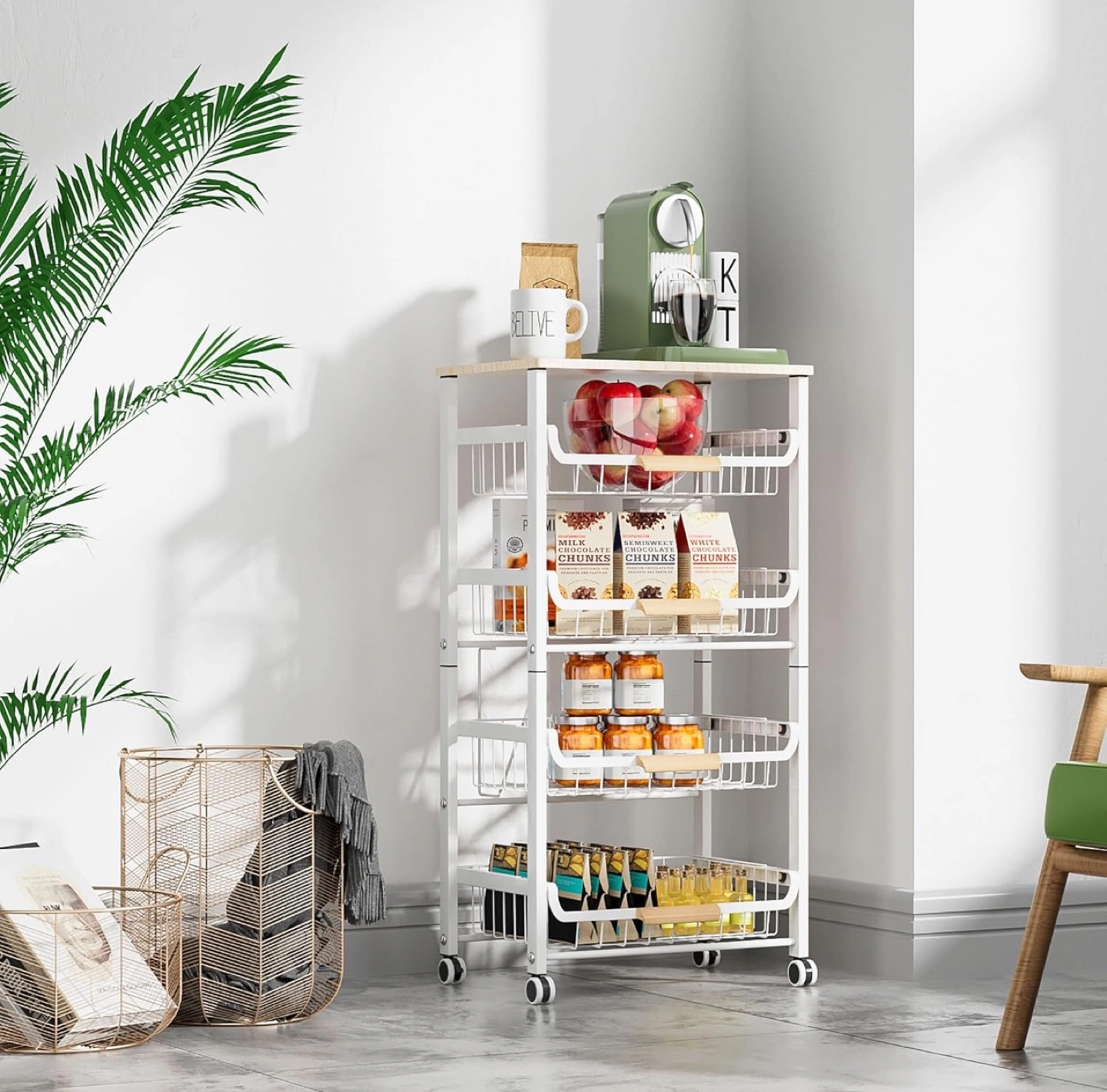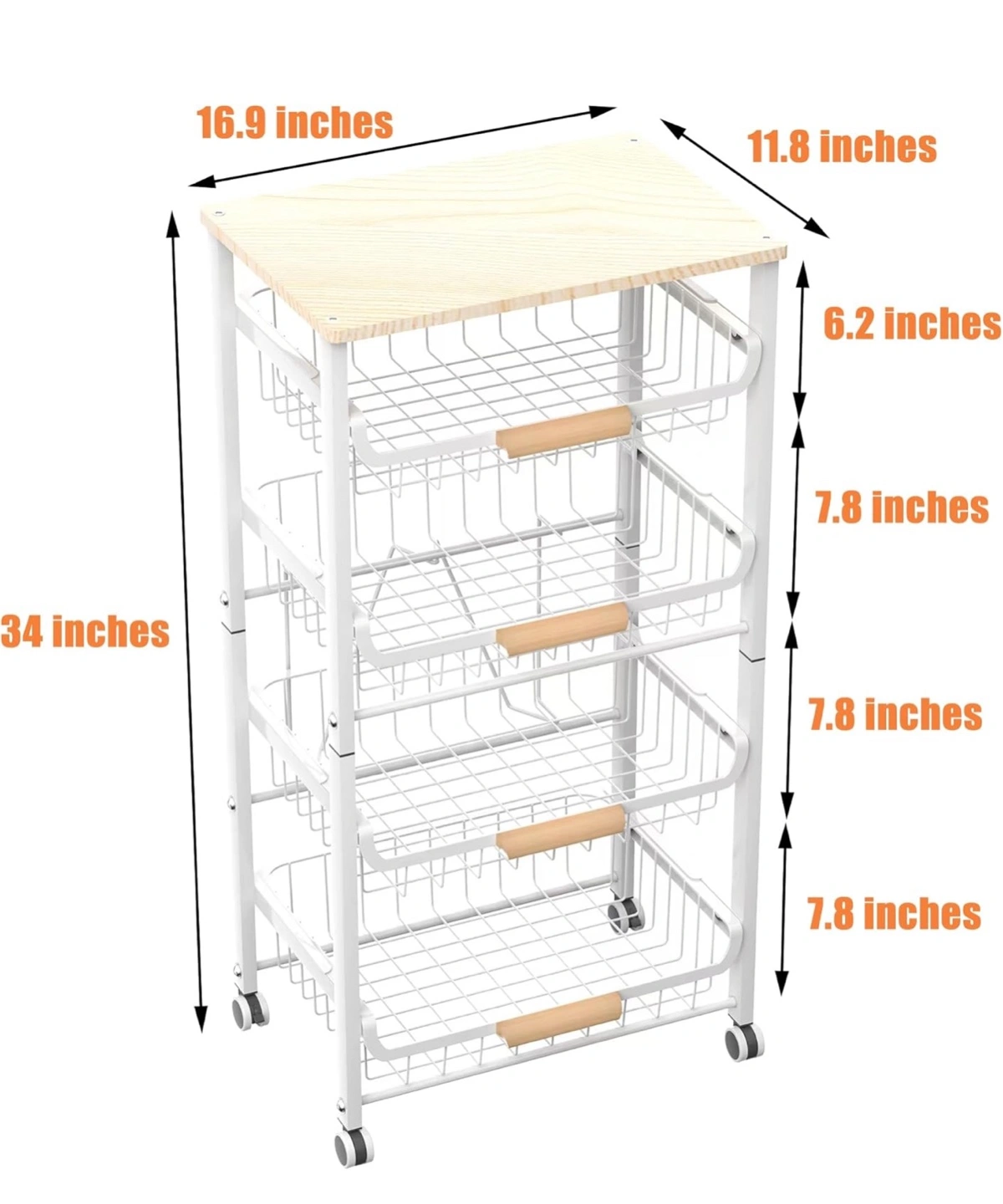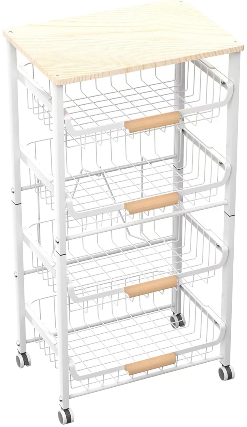 Four-tier rolling cart. White metal frame. Wooden top shelf. Four pull-out wire baskets. Easy assembly. Great for kitchen, pantry, bathroom, or other storage needs.