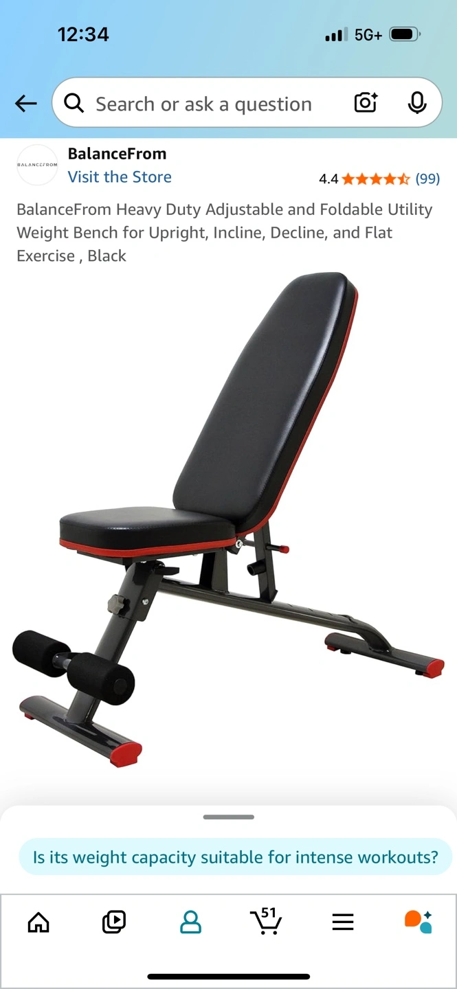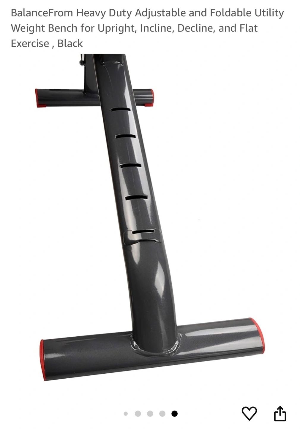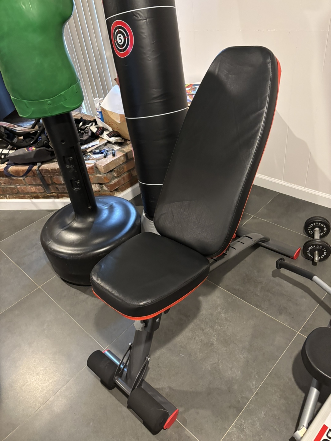 Heavy duty adjustable and foldable utility weight bench. Suitable for upright, incline, decline, and flat exercise. Black with red accents.