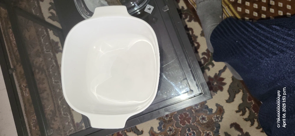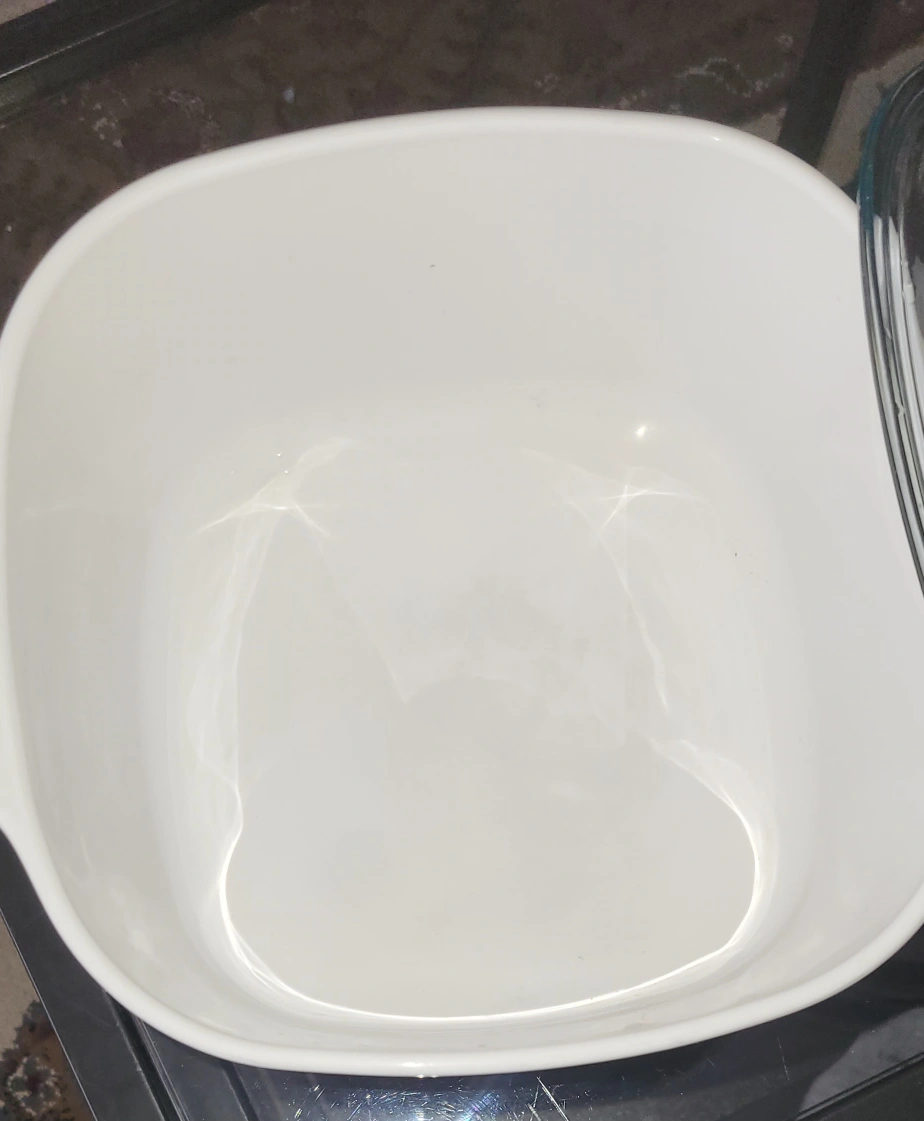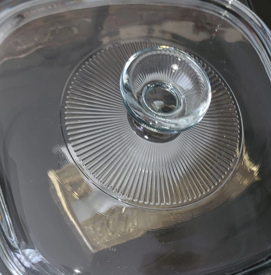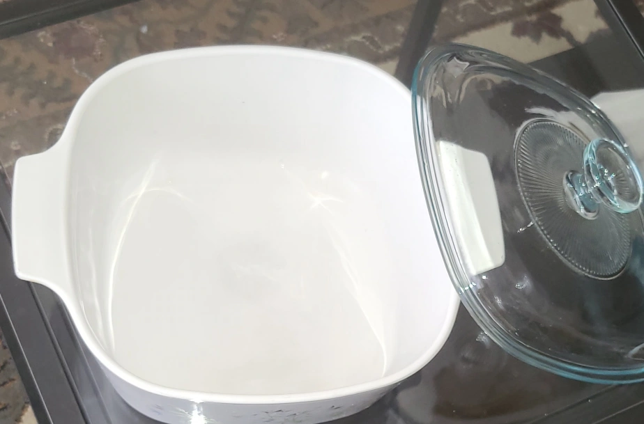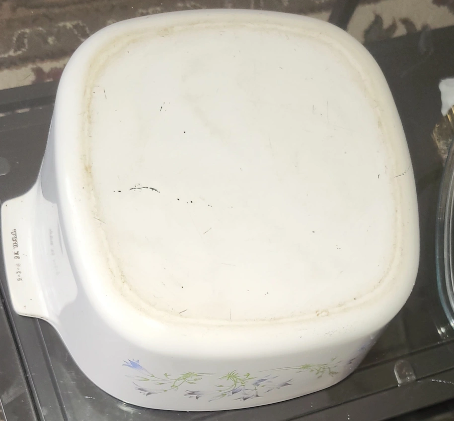 Square baking dish. Floral pattern. Glass lid with knob. Oven-safe. White base with blue flowers.