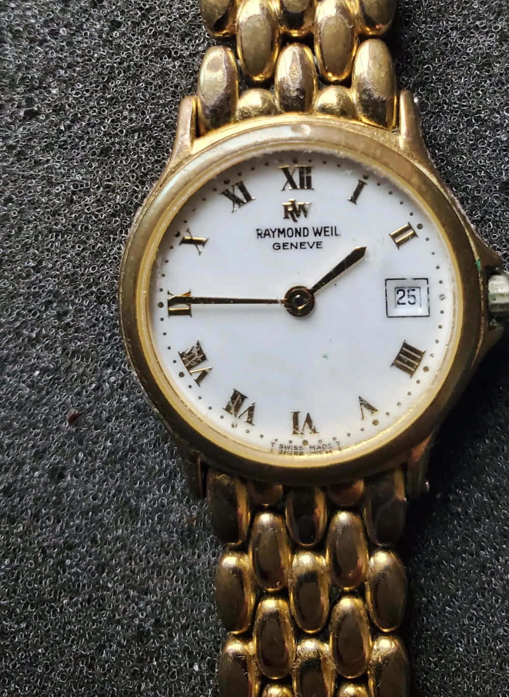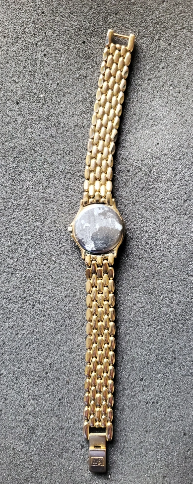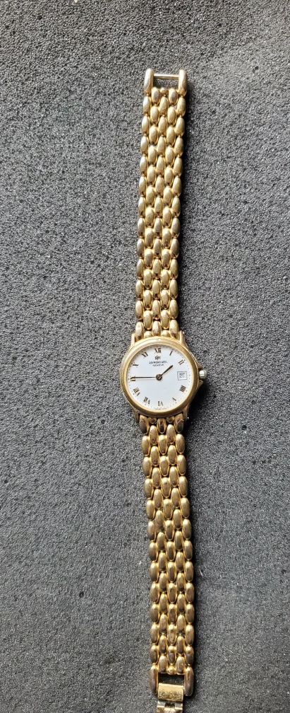 Gold tone bracelet. White face. Roman numerals. Quartz movement. Date window.