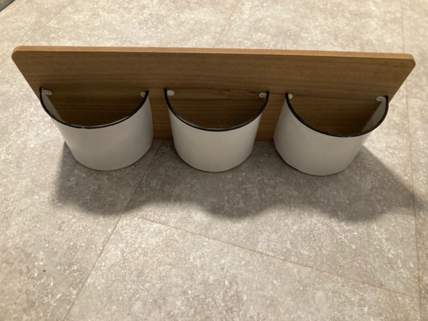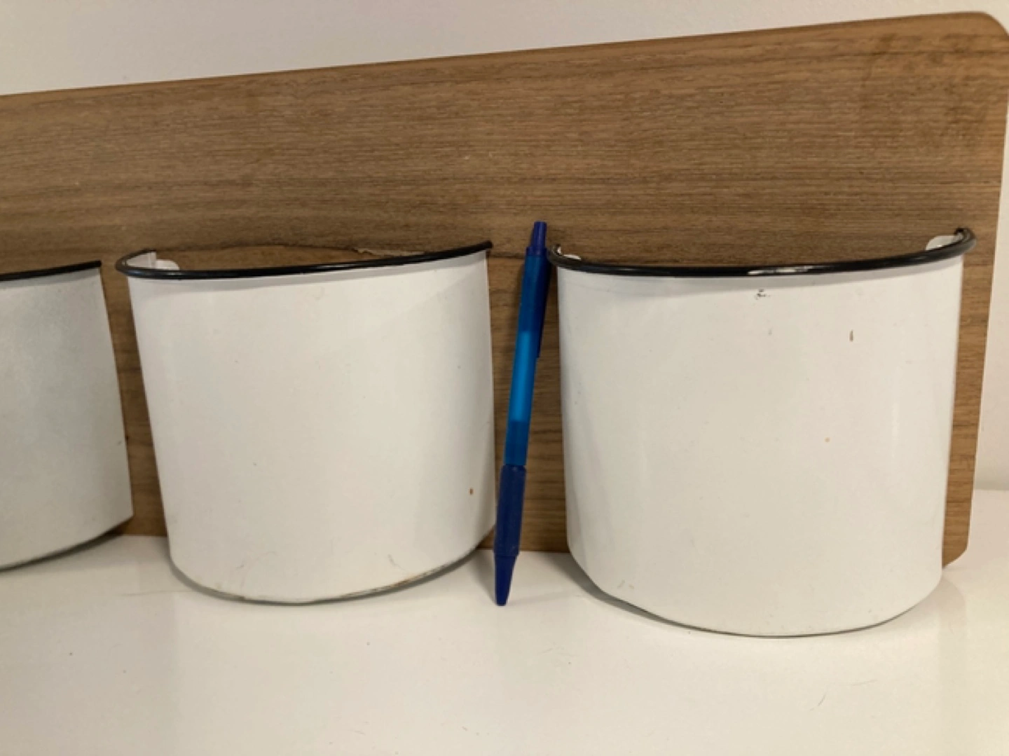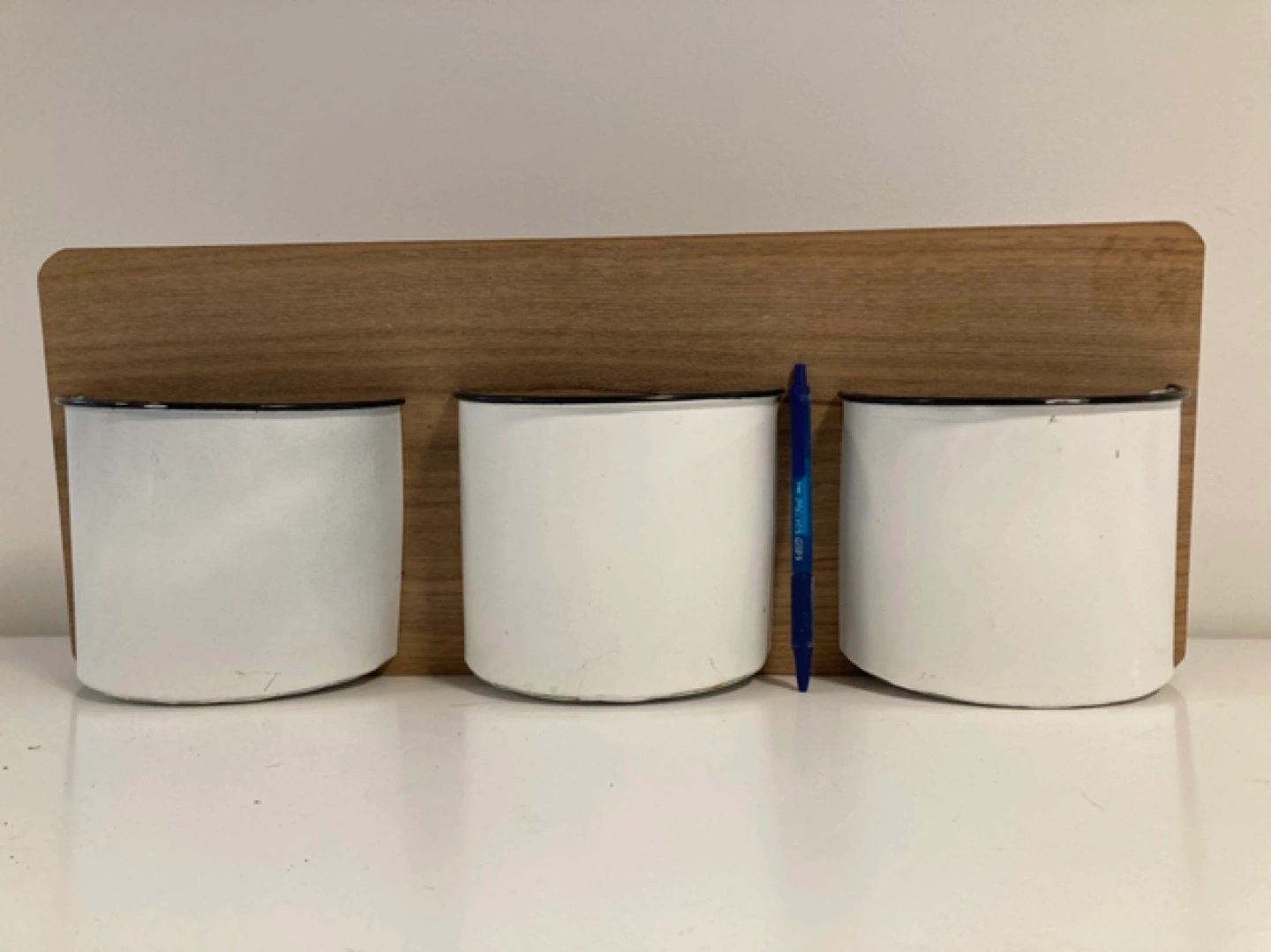 Wooden organizer with three enamelled metal containers. Great for storing small items. Wall mountable.
