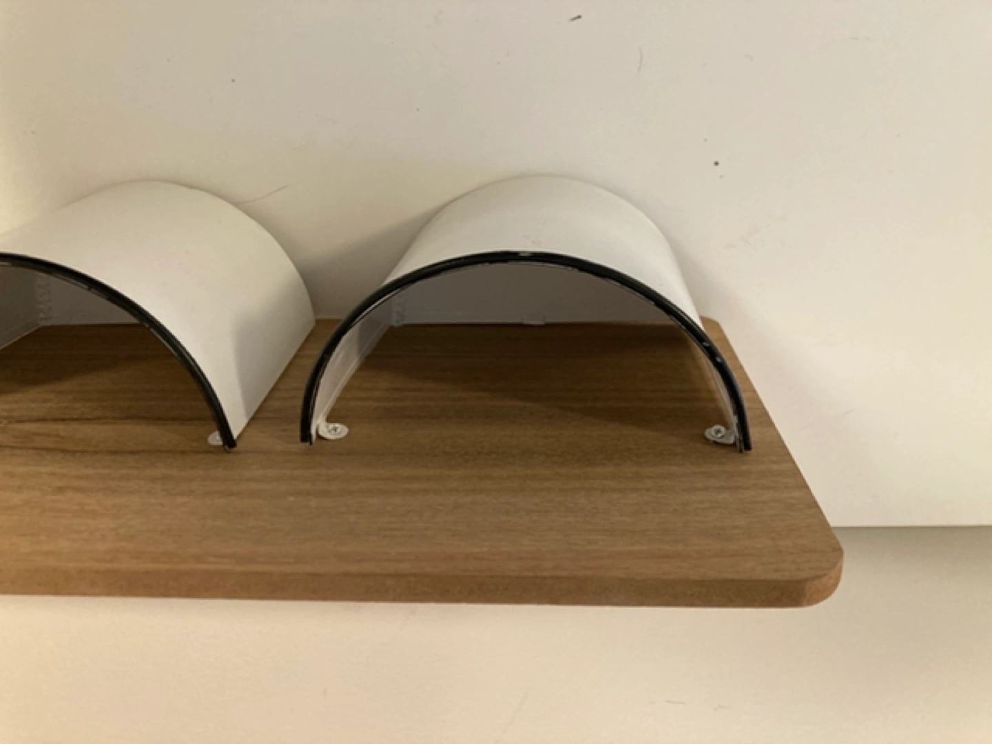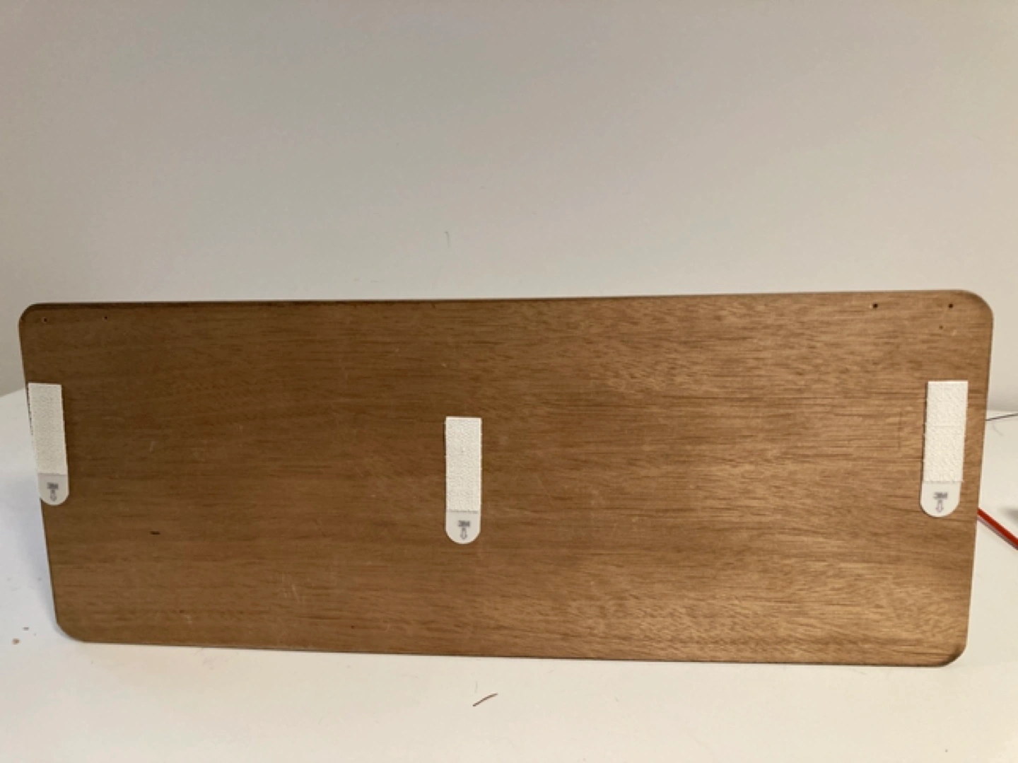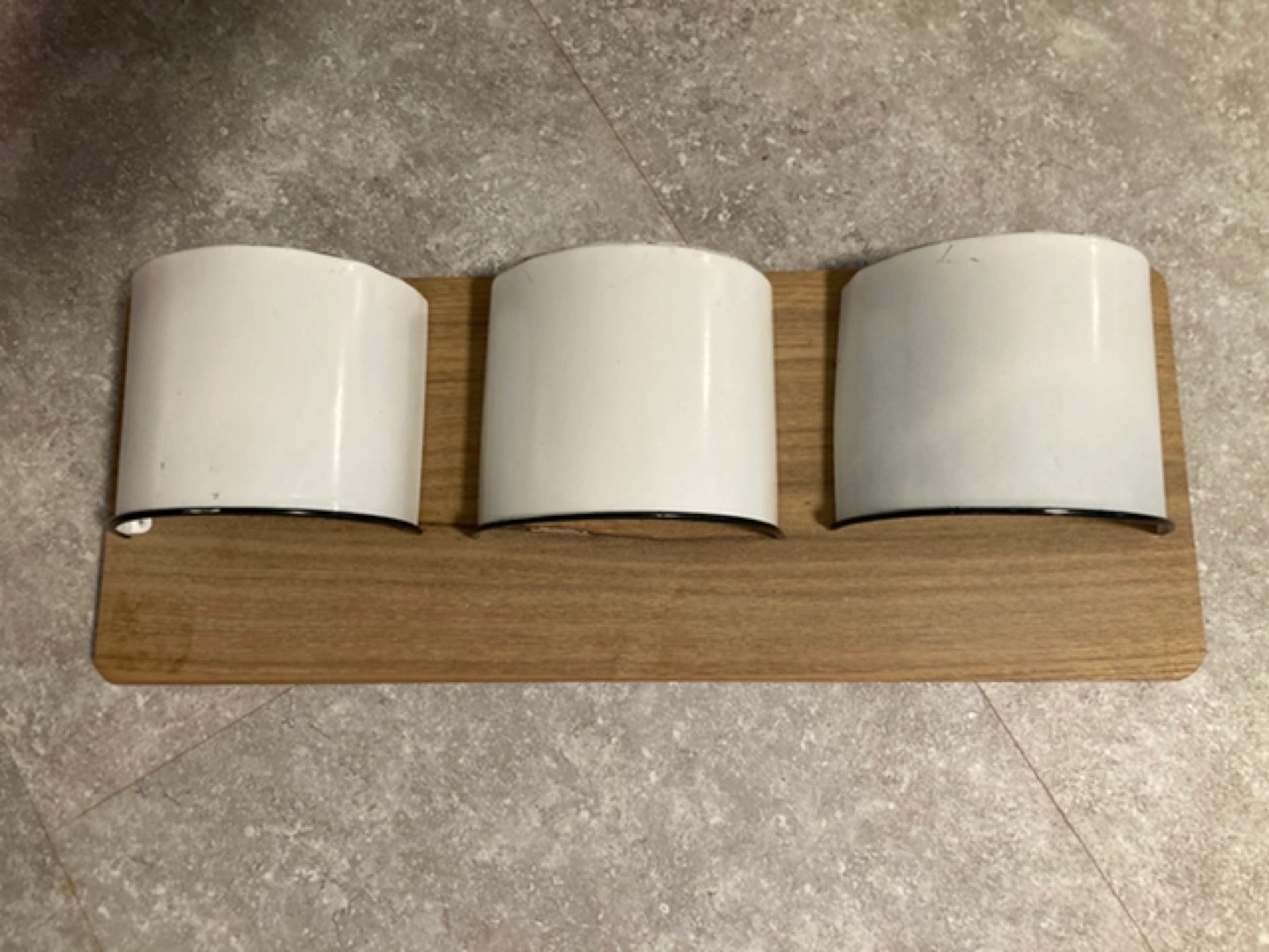 Wooden organizer with three enamelled metal containers. Great for storing small items. Wall mountable.