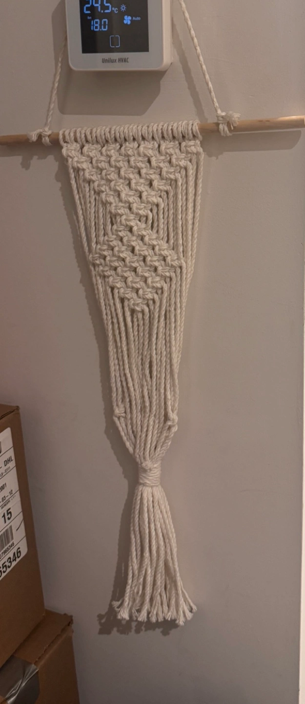 Cream-coloured macrame wall hanging. Features a geometric pattern and a long tassel. Hangs from a small wooden dowel.